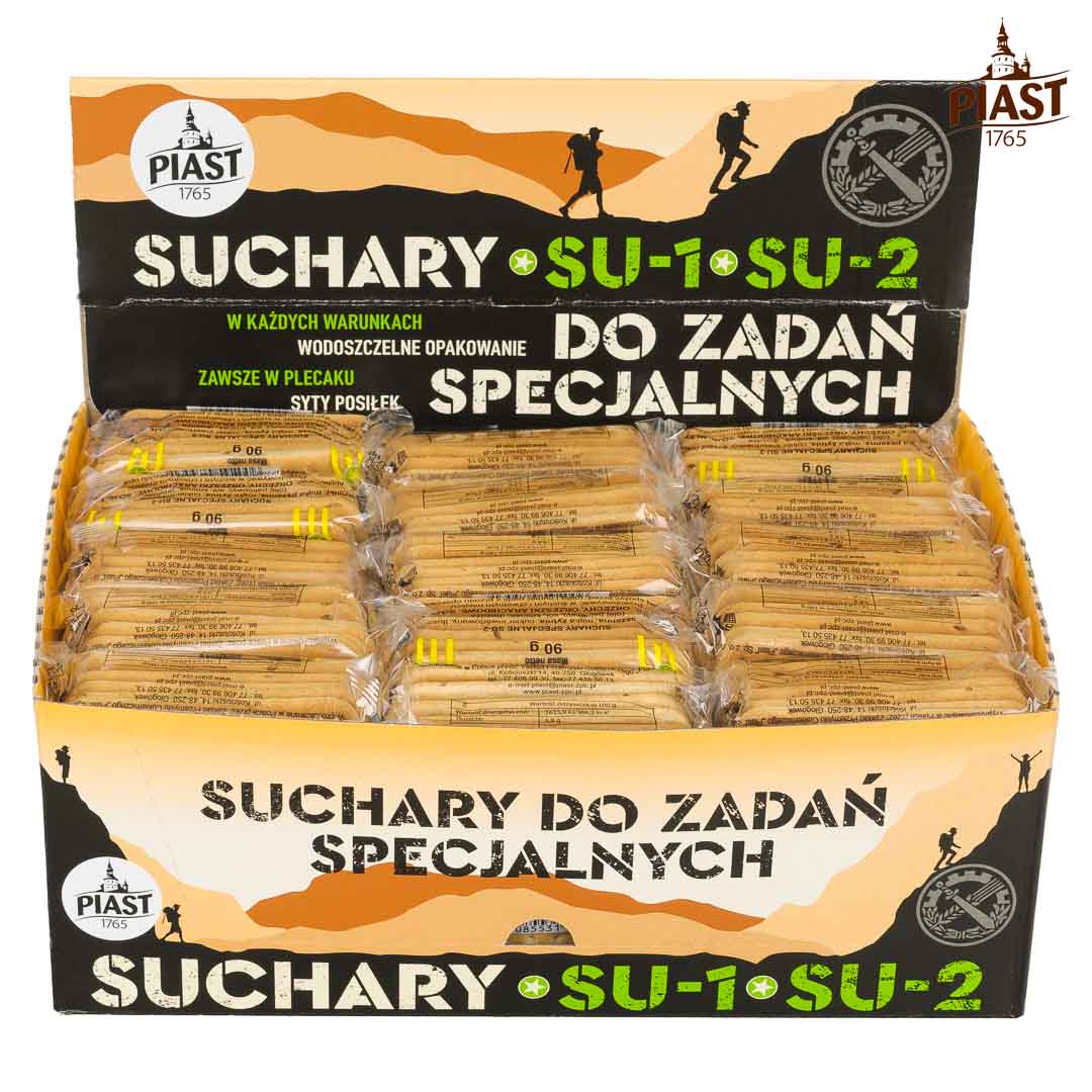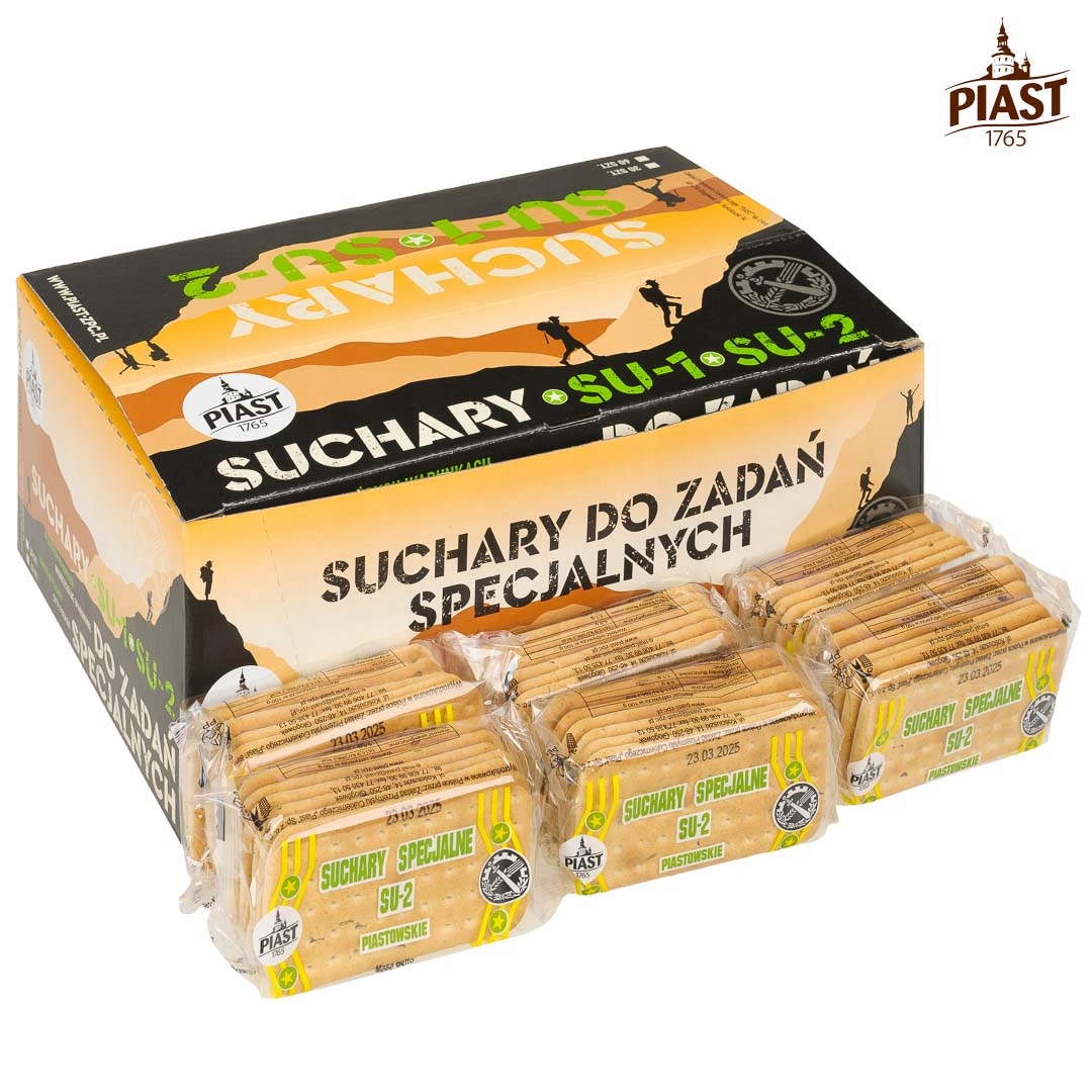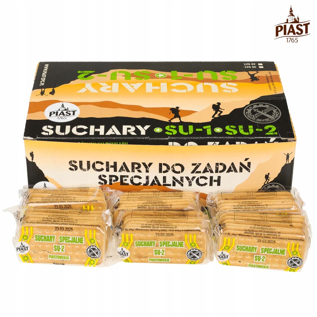 Продовольственный паек Войска Польского, специальные рюкзаки СУ-2. Продукт польской компании ZPC Piast, производящей по военному контракту. На солдатском жаргоне их в шутку называют «Панцервафли». Сухари свежего производства, вопреки своему популярному названию и привычкам, сухари не твердые и имеют очень хороший вкус. Сучары Пястовские – это хлебобулочные изделия по натуральному и традиционному рецепту. Добавление тмина благотворно влияет на пищеварительную систему и содержит витамины: А, В6, С, Е, рибофлавин, ниацин, тиамин и фолиевую кислоту. Забудьте все, что вы когда-либо знали о военном печенье.