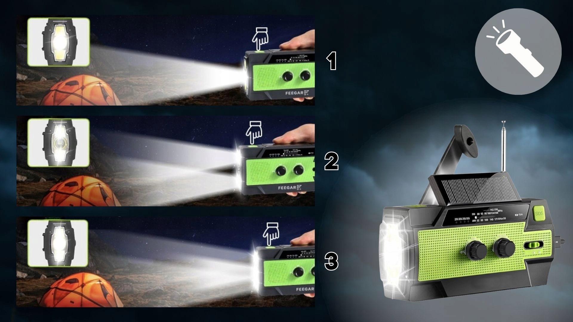 - ✔Многозадачность- радио, фонарик, сигнал SOS, павербанк, ночник с датчиком движения