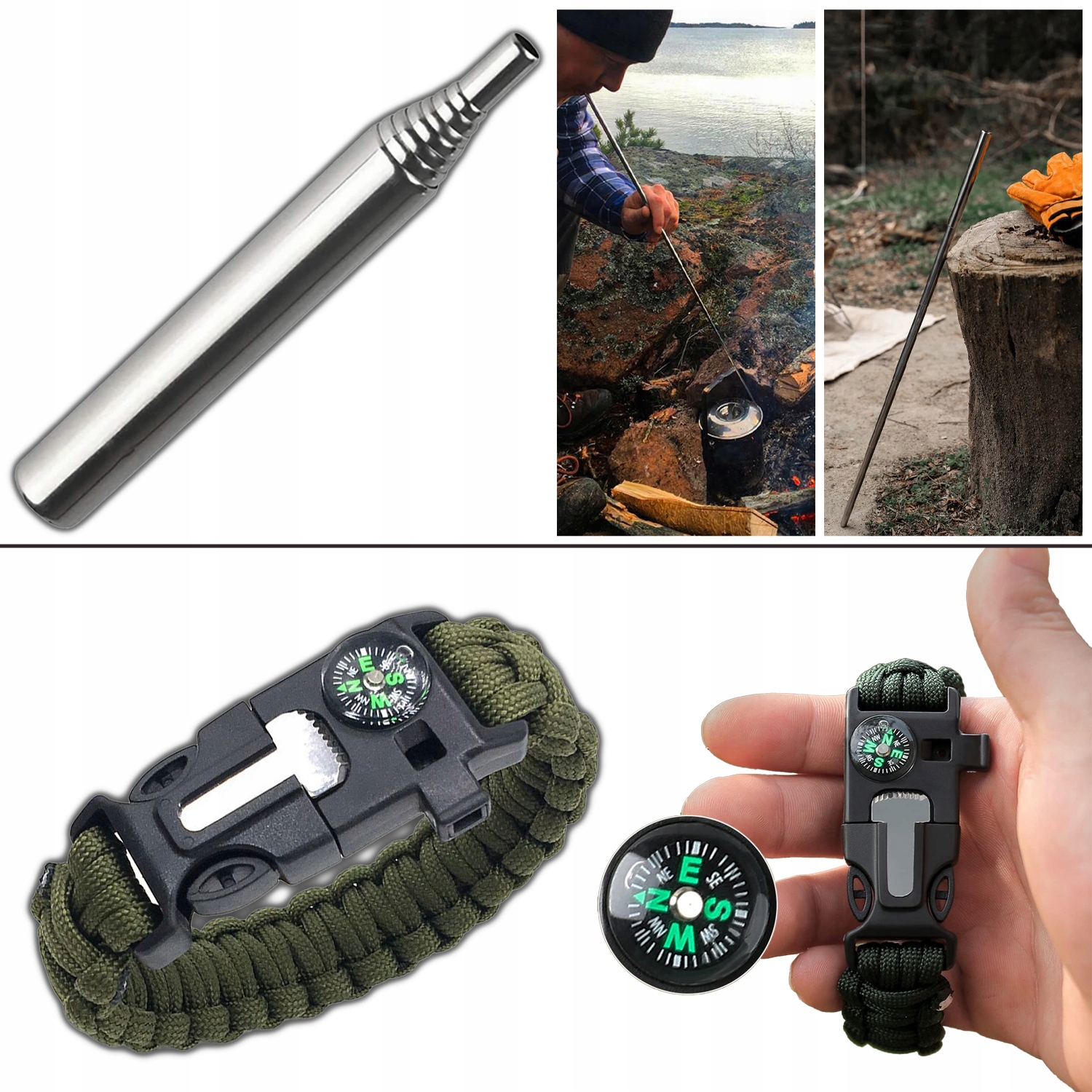 Разжигатель, веревка (паракорд), компас, свисток