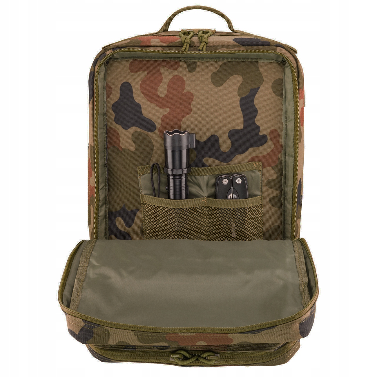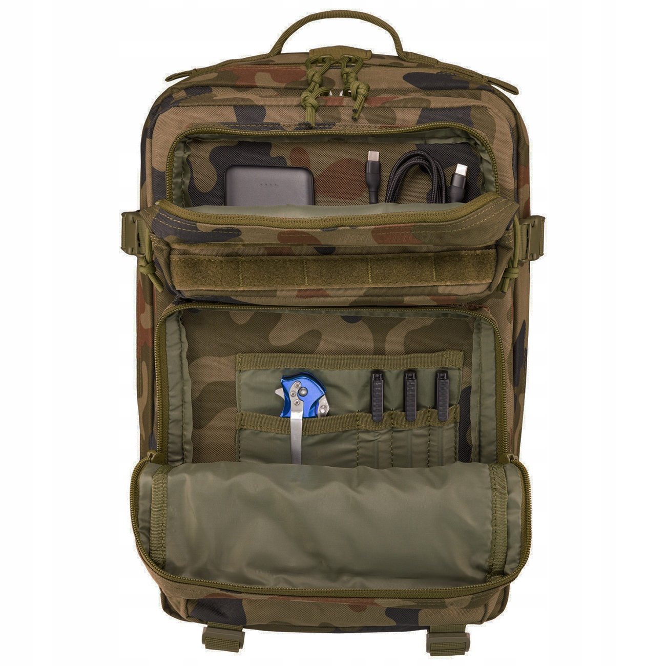 Внешние лямки совместимы с системой MOLLE/PALS, что позволяет прикрепить дополнительное снаряжение. и увеличить вместимость рюкзака. Боковые компрессионные ремни позволяют подогнать рюкзак под его содержимое. Мягкие лямки и задняя часть рюкзака с вентиляционными каналами обеспечивают комфорт при ношении даже при большой нагрузке. Ремень шириной 5 см оснащен практичными D-образными кольцами. Кроме того, рюкзак имеет регулируемый набедренный ремень, который помогает лучше распределять вес, и ручку для переноски рюкзака в руке.