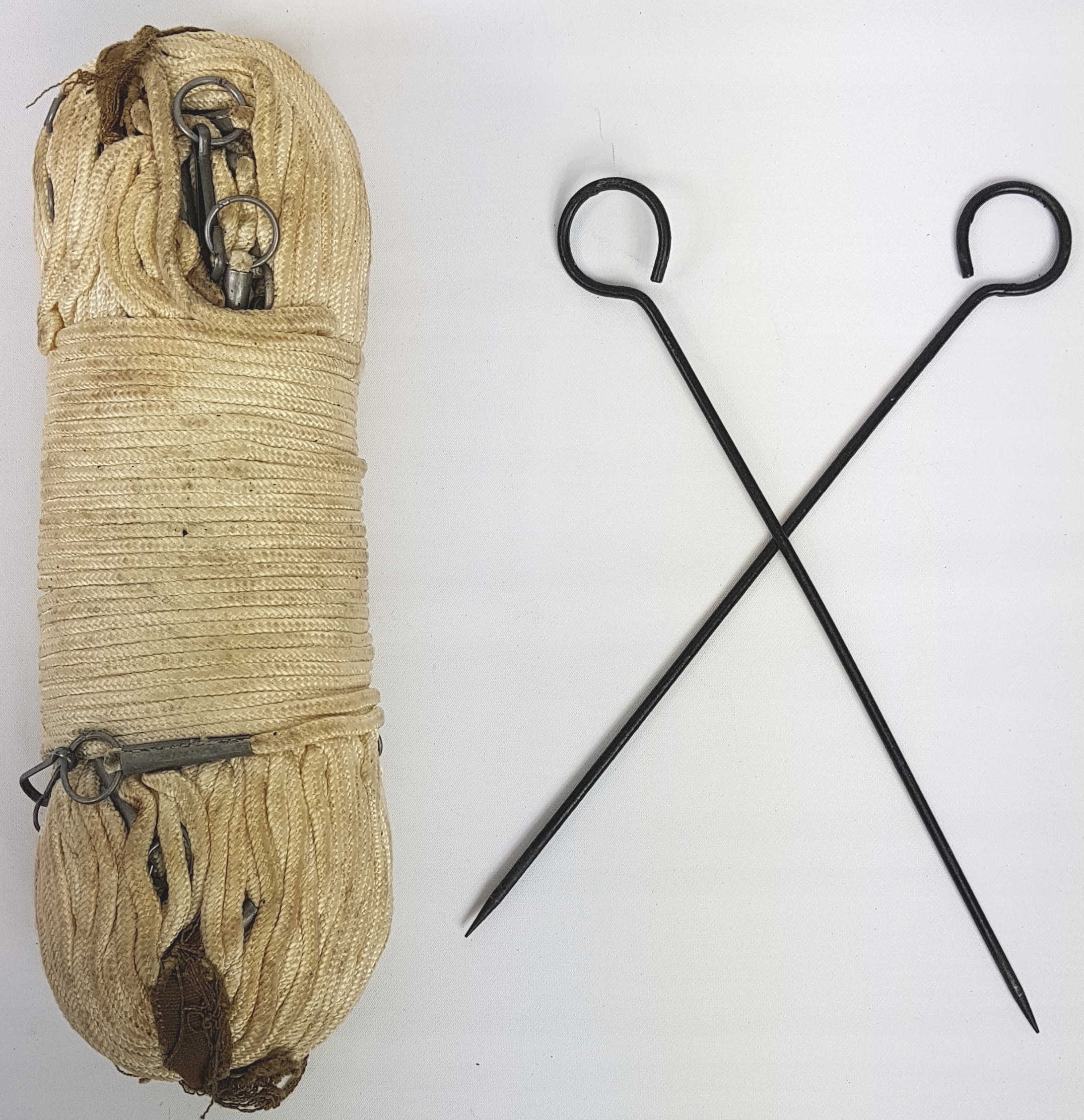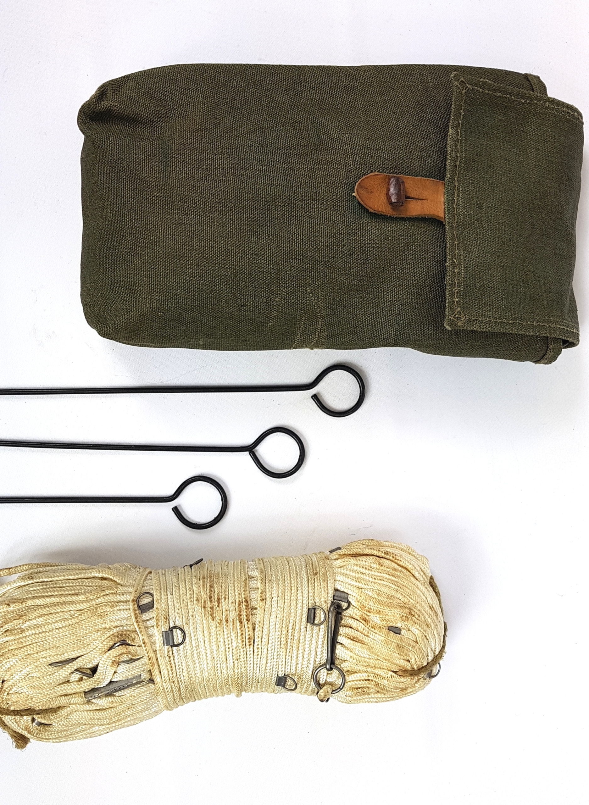 Оригинальная военная саперная веревка в брезентовом чехле, в комплекте с 15 булавками. Длина веревки около 100 м.