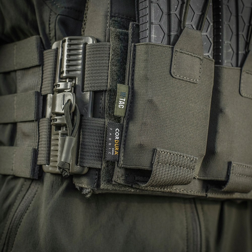 В нижней части тактического жилета имеется быстросъемный модуль с 3 магазинами, который надежно удерживает магазины. Чтобы избежать случайного снятия с основы-липучки, она крепится к ремням-держателям пластины с помощью карабинов Woojin.