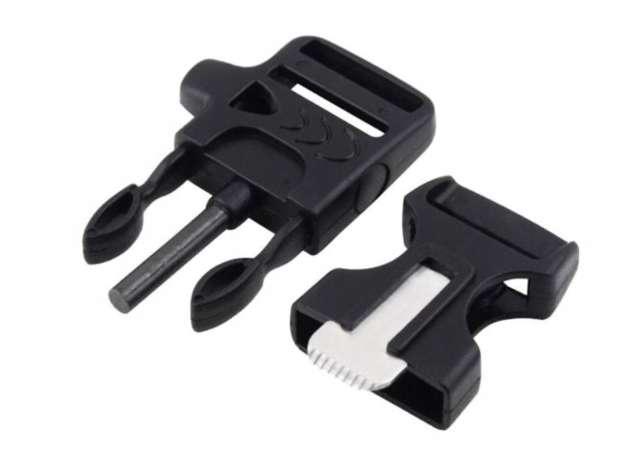В застежке браслета есть Tinder, спасательный свисток, резание лезвия и компас .