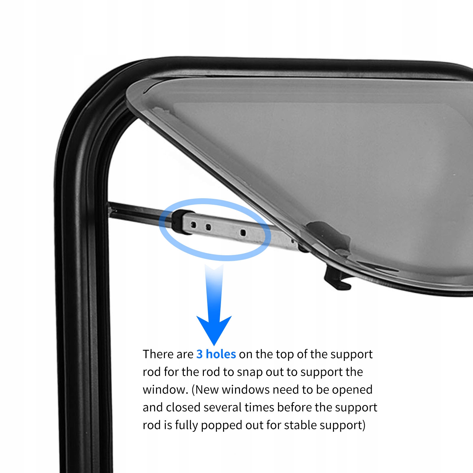 5. Стабильная опора: окно оснащено парой опорных планок из алюминиевого сплава для поддержки оконного проема. В верхней части опорной планки есть 3 отверстия, через которые можно выдвинуть планку для поддержки окна.