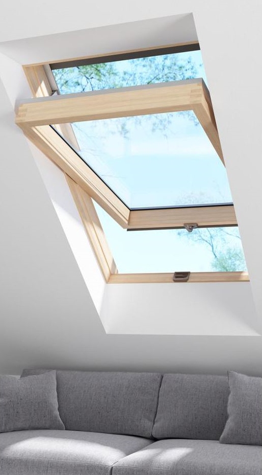 Масардное окно Optilight имеет классическую центральную ось поворота, что обеспечивает легкое открывание и закрывание окна, а также удобное положение для мытья наружного стекла.