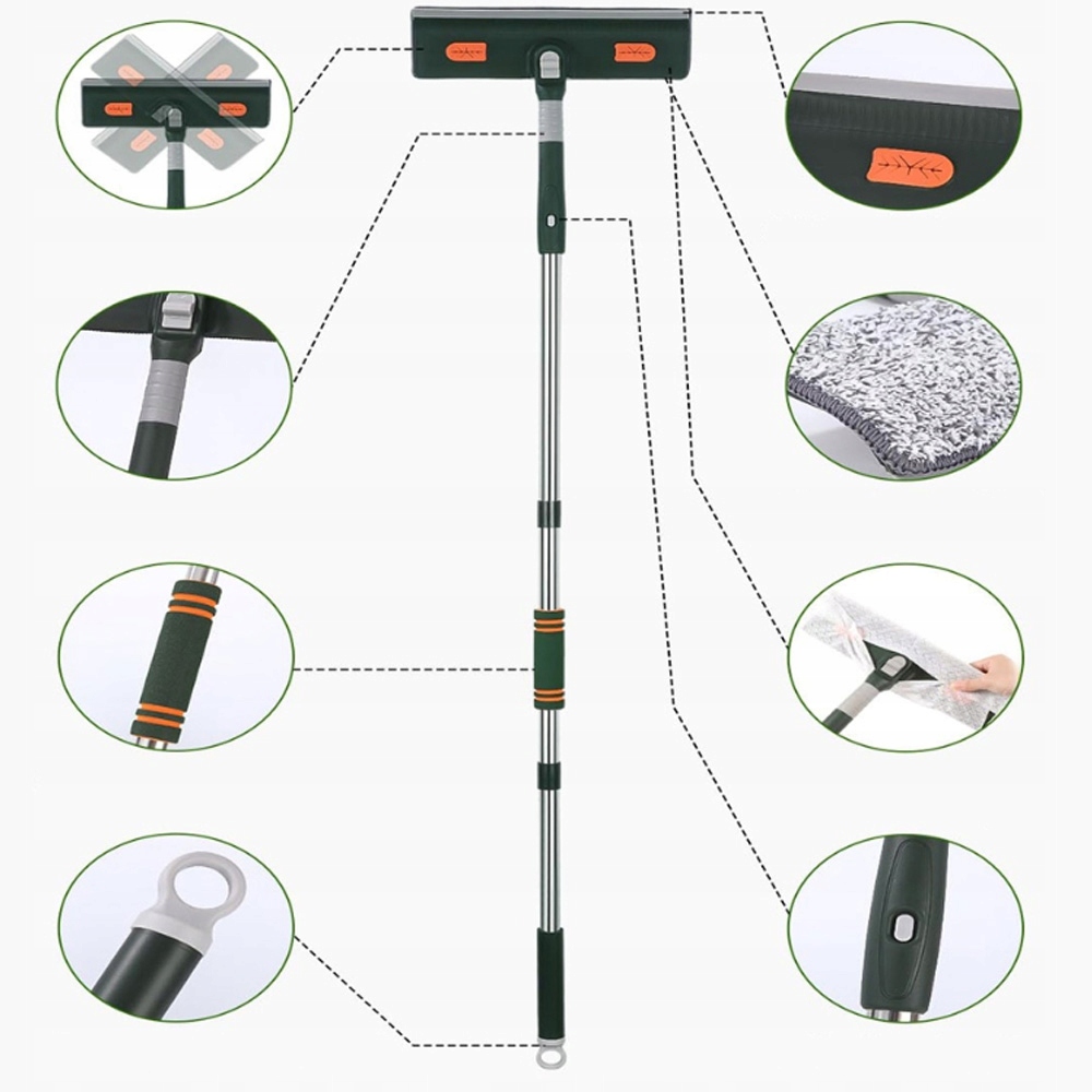 Только с одной кнопкой вы можете легко повернуть чистящую головку, чтобы очистить углы и края стекла снаружи окна. Чистящая головка может быть перемещена так, чтобы ткань плотно прилипала к поверхности окна. Чистящая головка может использоваться в одиночку или вместе с телескопическим стержнем для очистки более высоких мест