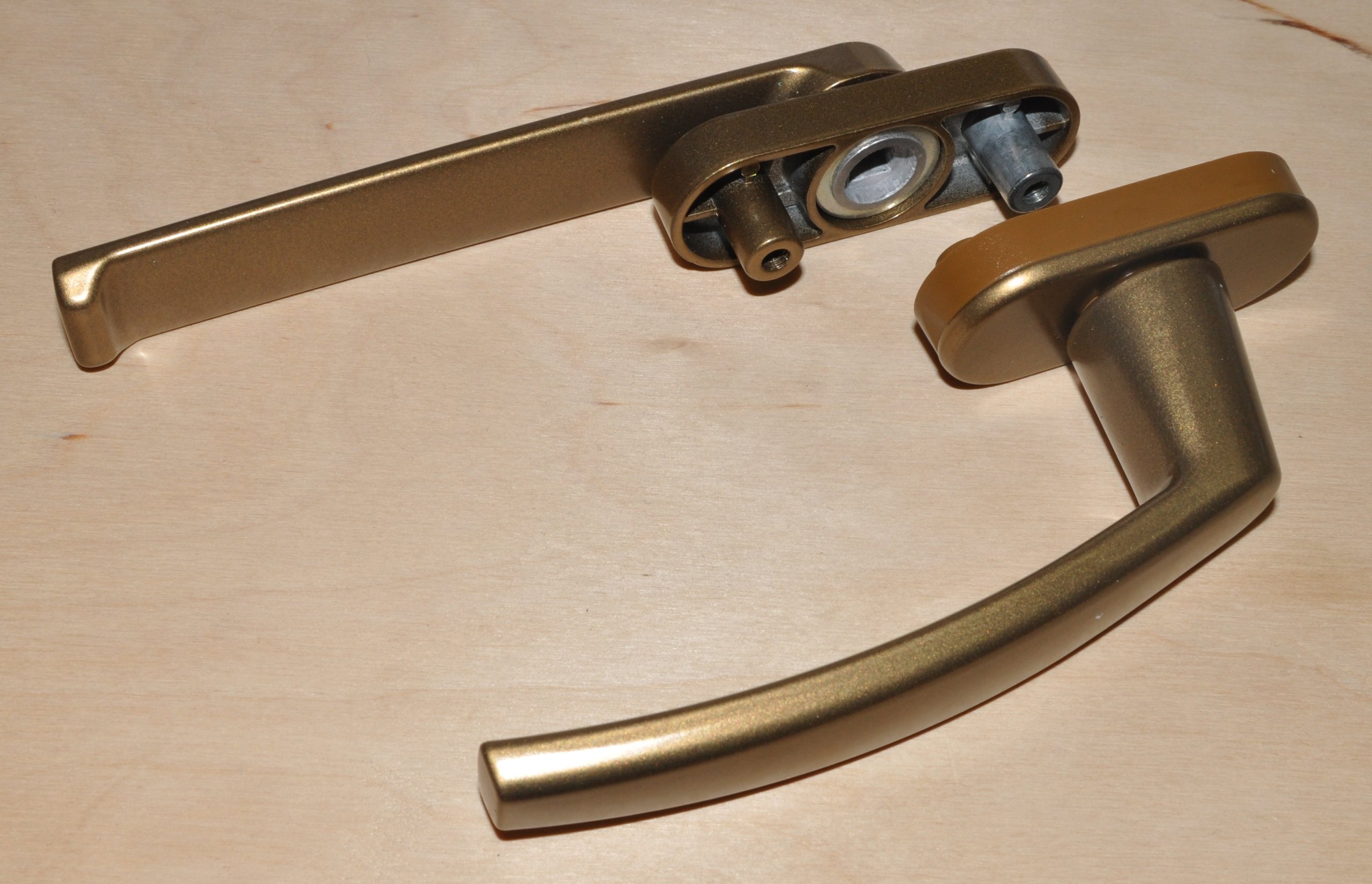 Описание: ручка изготовлена из металла, окрашенного в цвет ЗОЛОТО (основа, в которую вкручиваются винты, металлическая, а основа во второй ручке - пластиковая). Ручка позволяет закрыть балконную дверь как изнутри, так и снаружи. Внешняя ручка имеет меньшее смещение от поверхности двери, что позволяет установить наружную рольставню. Крепежные винты подготовлены таким образом, что их длину можно подогнать под толщину любого окна. Ручка оснащена защелкивающимся механизмом, который позволяет устанавливать ручку в различные положения: закрытое окно, открытое окно, незапечатанное окно и т.д. Установка предполагает откручивание старых ручек (2 винта с заглушками) и прикручивание новых ручек вместо старые, предварительно просверлив в створке окна отверстия на направляющем штифте и на шурупах, позволяющих прикручивать ручки. Ручки прикручены двумя винтами 5,0 мм.