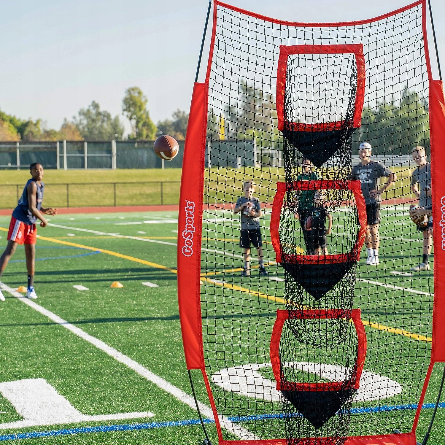 С сеткой футбольных мишеней GoSports игроки могут повысить точность бросков благодаря трем основным мишеням в зоне приема, в которые можно бросать мяч в сетку. Тренеры могут легко включать цели в упражнения по хвату, броску, короткому и длинному пасу и т. д. Как известно любому тренеру, хотя мощная рука и важна, сила без точности может помешать любому игроку или квотербеку. Вот почему GoSports Football Target Net — такое ценное тренировочное пособие для игроков и тренеров!