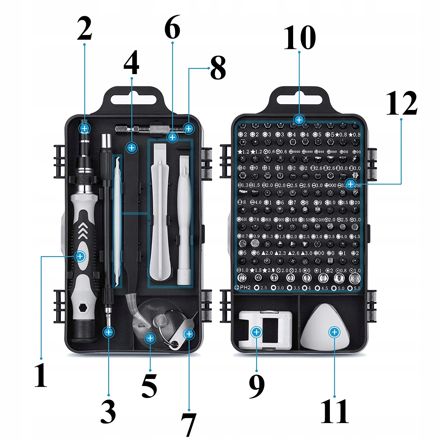 - 7 шт. бит с наконечником гнезда: 1x 2,5 , 1x 2,0, 1x 3,5, 1x 4,0, 1x 4,5 , 1x 5,0 , 1x 5,5