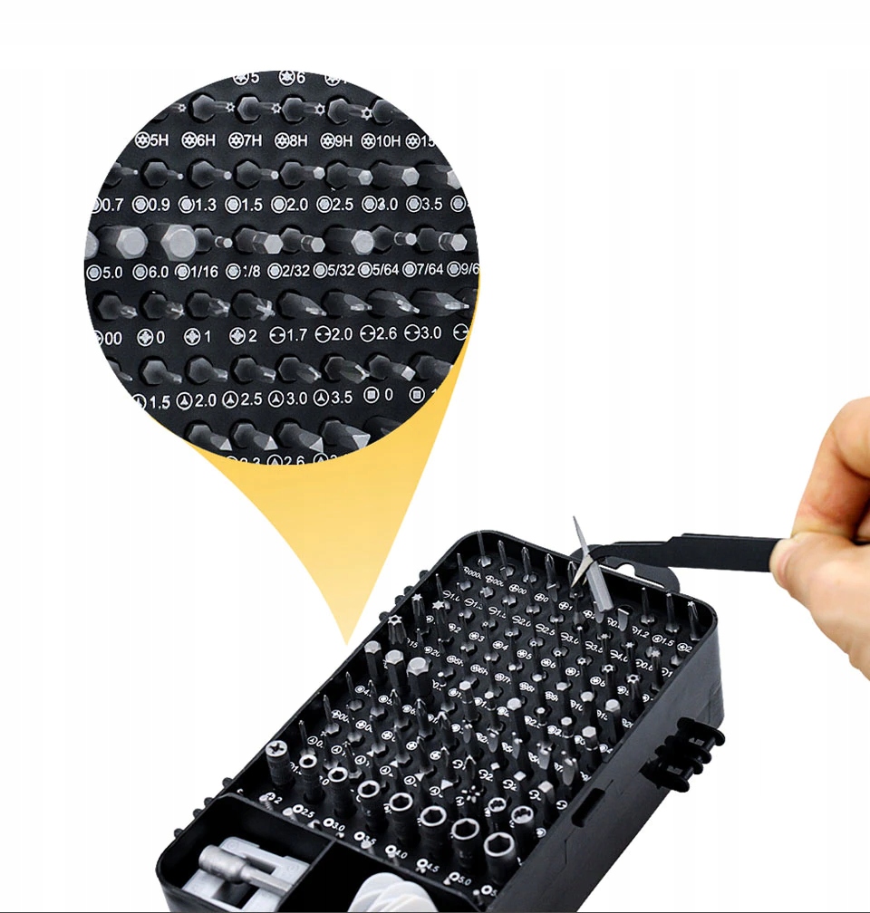 - 23 штуки Шестигранные биты: 2x H0.7, 2x H0.9, 2x H1.0, 2x H1.3 , 2x H1.5, 2x H2.0, 2x H2.5, 2x H3.0 >, 2x H3.5, 2x H4.0, 1x H4.5, 1x H5.0, 1x H6.0