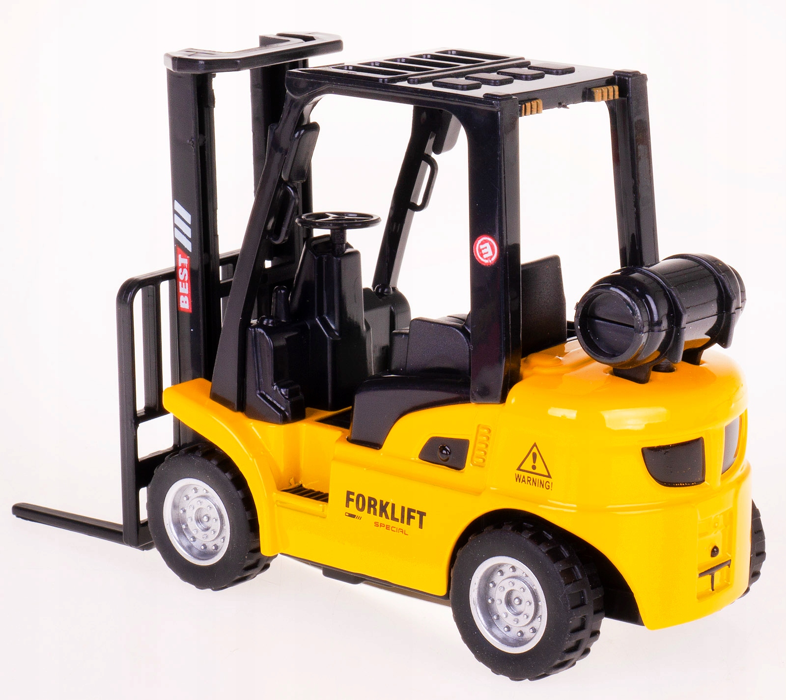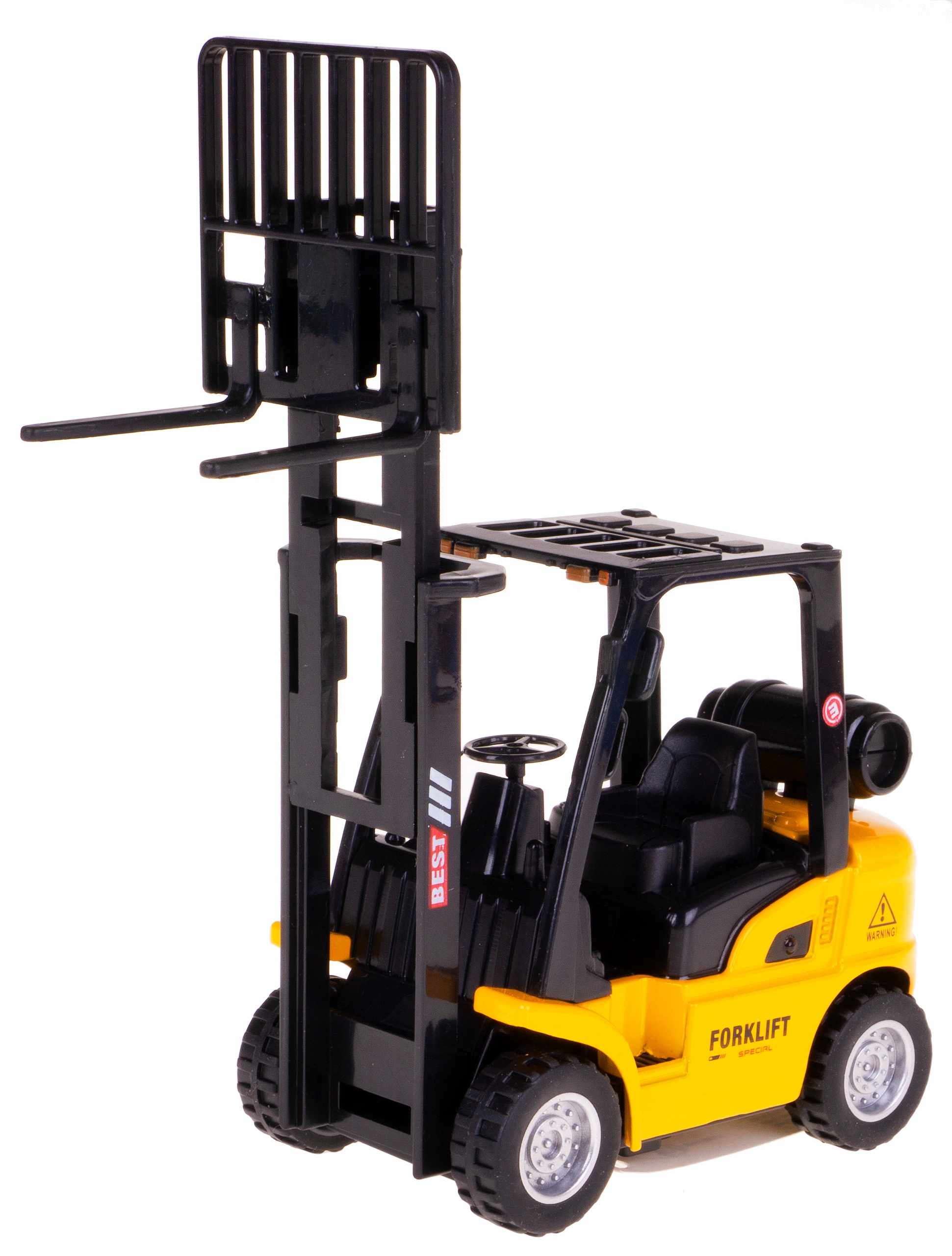 Модель вилочного погрузчика из металла и пластика с инерционным приводом на резиновых шинах.