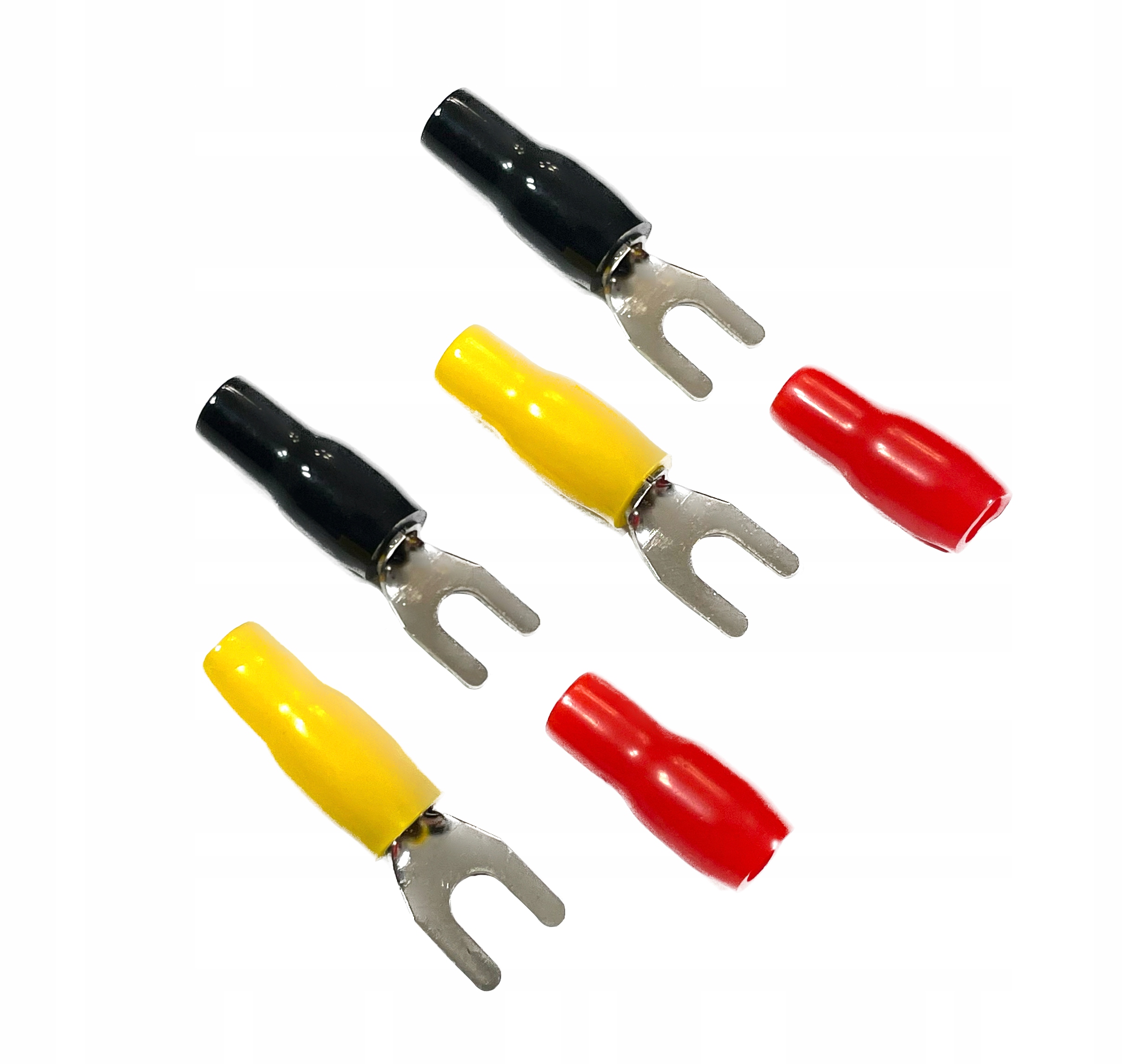 4 разъема-лепестка для кабеля сечением 3-4 мм2 - под винт М4, ширина 8,5 мм, никелированные, 2 красных, 2 желтых и 2 черных рукава из ПВХ