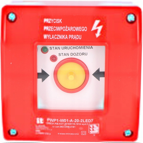 Ручная кнопка предназначена для активации «Пожарного выключателя», который отключит электропитание здания от источника электроэнергии в случае возникновения пожара во время спасательной операции. В пожарных зонах объемом более 1000 м³ или содержащих взрывоопасные зоны следует применять противопожарный выключатель, отключающий электропитание всех цепей, за исключением цепей, питающих установку и устройств, работа которых необходима при пожаре. Автомат противопожарной защиты должен располагаться вблизи главного входа на объект или разъема и иметь соответствующую маркировку. Отключение электропитания пожарным выключателем не может привести к автоматическому включению второго источника электроэнергии, в том числе генераторной установки. Исключением являются источники питания электроприборов, которые должны функционировать во время пожара.Кнопку ручного привода ПРМ1 можно использовать в качестве «Пожарного выключателя питания» при условии размещения над ней таблички: «Пожарный выключатель питания». В комплект входит самоклеящаяся табличка: «Пожарный выключатель».Кнопка ручного пуска PWP1 с двойной светодиодной сигнализацией предоставляет информацию о: 1. Зеленый светодиод – статус запуска2. Красный диод – состояние контроля.Светодиоды завершаются соединительным блоком. Красный светодиод должен гореть при включении выключателя, при разбитии стекла красный светодиод должен погаснуть и загореться зеленый светодиод, что информирует об отключении электричества в здании. Питание зеленого светодиода должно осуществляться от отдельного источника питания, желательно перед выключателем.Минимальное количество проводов, необходимое для подключения выключателя: Исполнение выключателя с 2 светодиодами: 1. 2 светодиода + 3 контакта – минимум 6 проводов 2,2 светодиода + 2 контакта – минимум 5 проводов 3,2 светодиода + 1 контакт – минимум 4 провода Национальная техническая оценка CNBOP-PIB – № CNBOP-PIB-KOT-2019 /0110-1014 издание 2 Национальный сертификат постоянства характеристик № 063-UWB-0186