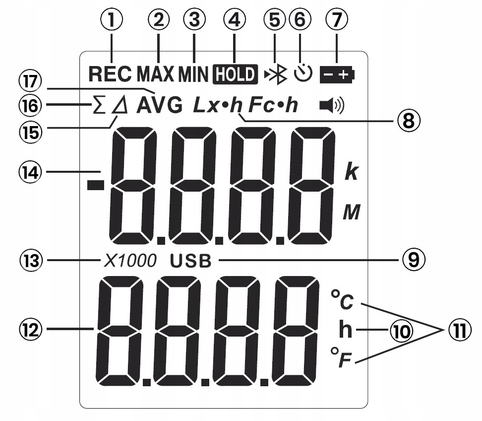 - Переключение между единицами освещения (люкс/Fc) и температурой (oC/oF).