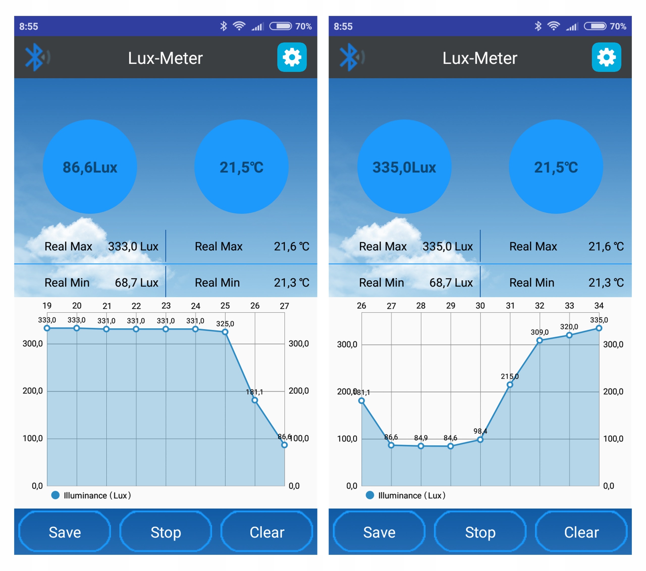 В приложении представлены данные реального измерения интенсивность света на графике. Это также позволяет вернуться к данным позже и удалить ненужные измерения.