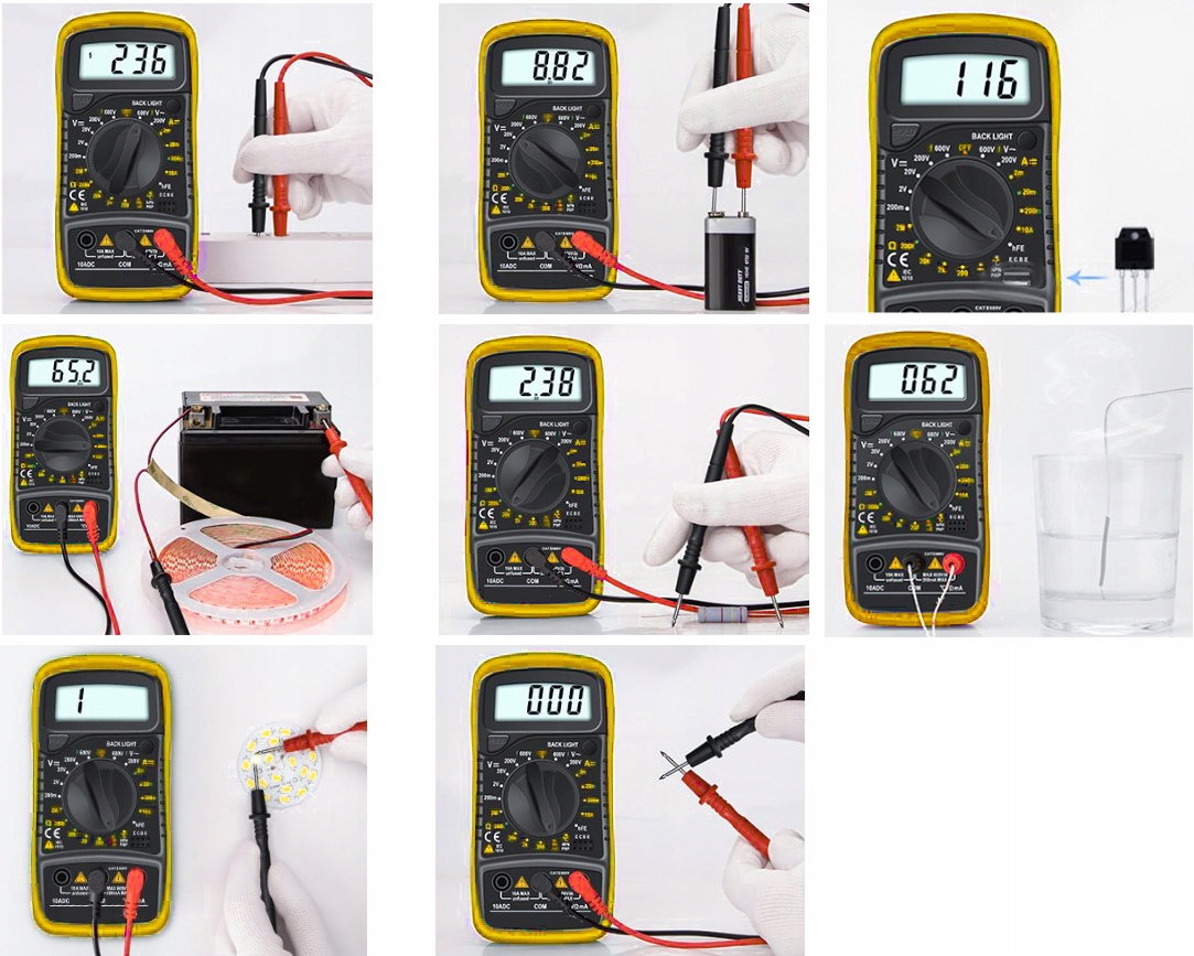 - ТЕХНИЧЕСКИЕ ХАРАКТЕРИСТИКИ - измерение переменного напряжения в диапазоне 0- 750В; измерение напряжения постоянного тока в диапазоне 0-1000В; Измерение постоянного тока в диапазоне 0-10А; измерение сопротивления в диапазоне 0-2 Ом; измерение коэффициента усиления транзистора hFE; проверка диодов; индикатор низкого заряда батареи счетчика; максимальное чтение 1999 г.; сигнализация поляризации при измерении постоянного тока и напряжения; сигнализация о выходе за диапазон измерения; источник питания: аккумулятор; размеры: 14х7х3,5 см; вес: 0,125 кг; вес в упаковке: 0,237 кг.