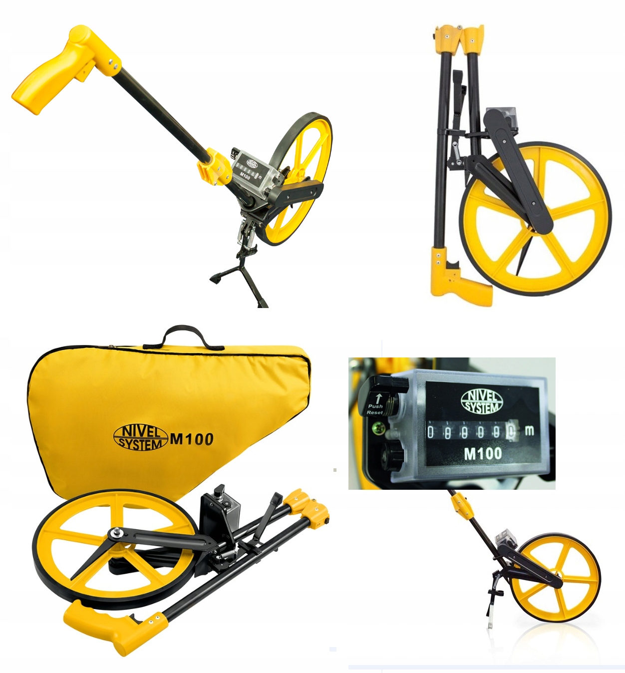 Одометр Nivel System M100 представляет собой измерительное колесо, приспособленное для измерения расстояний на различных поверхностях. Измеряет прямые линии, кривые и неправильные формы. Одометр отличается интуитивно понятным и простым управлением, а легкая конструкция облегчает транспортировку.M100 обеспечивает измерения на расстояниях до 99 999,9 м. Большой, разборчивый одометр повышает удобство считывания расстояния, а складная ручка позволяет складывать одометр, ограничивая его размер при хранении или переноске. Одометр Nivel System M100 широко используется для измерения расстояний подрядчиками, оценщиками, фермерами, агентами по недвижимости и полицией (измерения проводятся после аварий). Он оснащен механическим счетчиком, который считает расстояние при движении вперед и вычитает его при движении назад. Пристрелка осуществляется с помощью рычага (свободные руки).