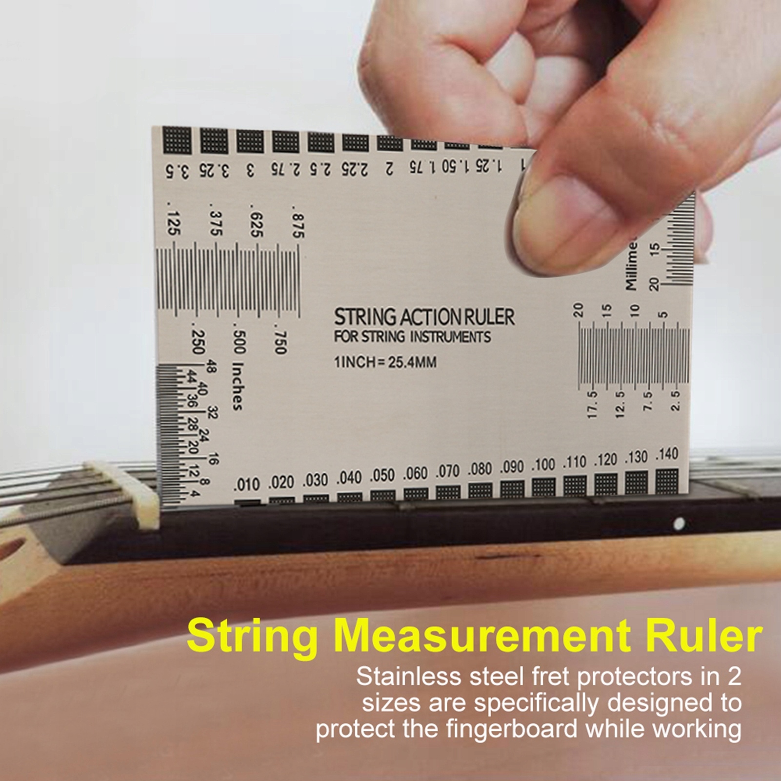 1. Измеритель обеспечивает тщательное измерение высоты струн, высоты седла грудины, глубины седло, высоты преобразователя, порогового зазора и высоты гайки.