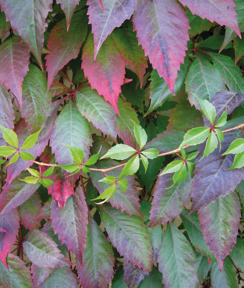 Листья: Пятилистные, зеленые, снизу серо-зеленые, осенью краснеющие. Отдельные листья длиной до 10 см, по краю зубчатые, обычно голые.