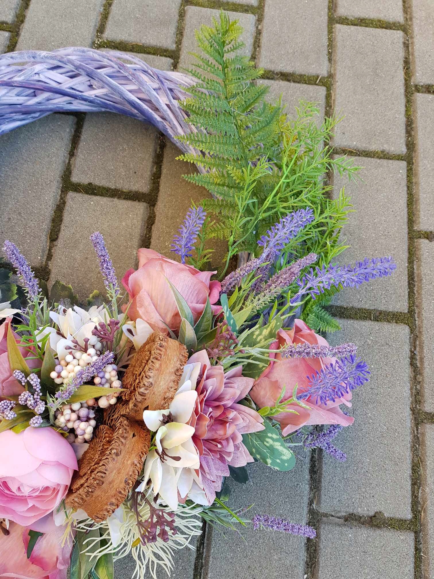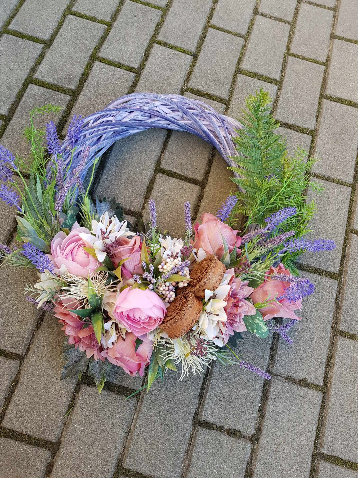Осенний плетеный венок диаметром 40 см, украшенный осенними розами и лавандой