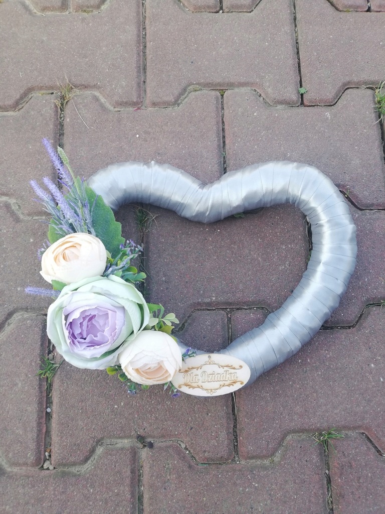 Основа венка — соломенное сердце, обмотанное атласной лентой, украшенное качественными цветами, представленными на фото.