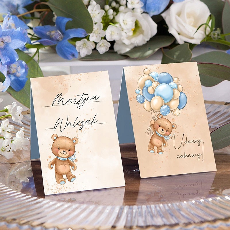 Планируете вечеринку для сына? На карточках с местами напишите имена, чтобы показать гостям их место за столом. Изделие декорировано изображением плюшевого мишки с воздушными шарами в голубых тонах. Это практичный гаджет, который также является элементом декора,