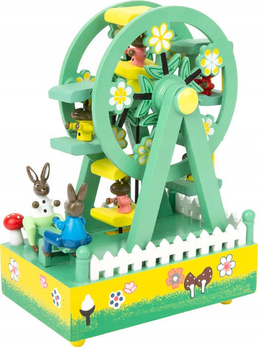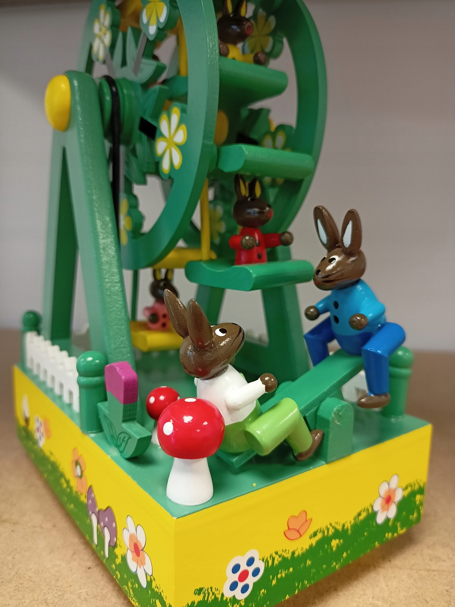 Музыкальная шкатулка в форме колеса обозрения, с фигурками зайчиков, выполненными с вниманием к деталям. Все это было сделано из дерева.
