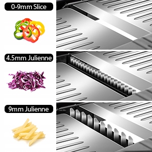 ✅mandoline для овощей премиум -класса: овощной слайлер из мандолины изготовлен из высококачественной нержавеющей стали, которую нелегко изгибать, трещины или ржавчины. Такой хороший слайсер мандолины делает наши лезвия очень острыми, и их нелегко обернуть. Обязательно вырезайте и получите чистые и даже аккуратные кусочки пищи. Мягкая ручка, не являющаяся скольжением, является эргономичной и обеспечивает удобную сцепление. В роторных лезвиях. Благодаря этому вы можете получить идеально плоские ломтики от 1 до 9 мм и 4,5 - 10 мм Жюльеном