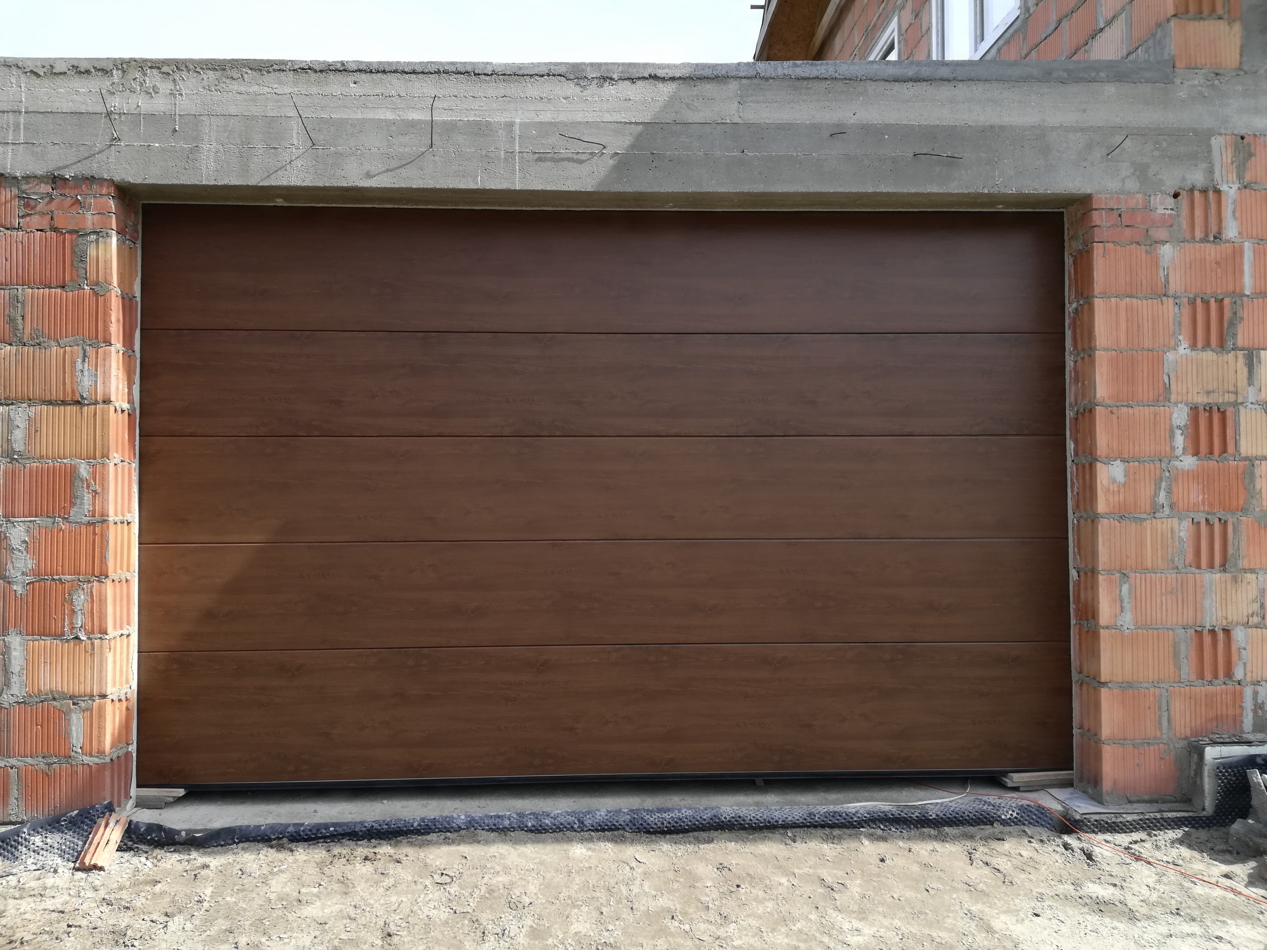 Гараж, сегментный ворота в основном коричневом цвете со структурой дерева