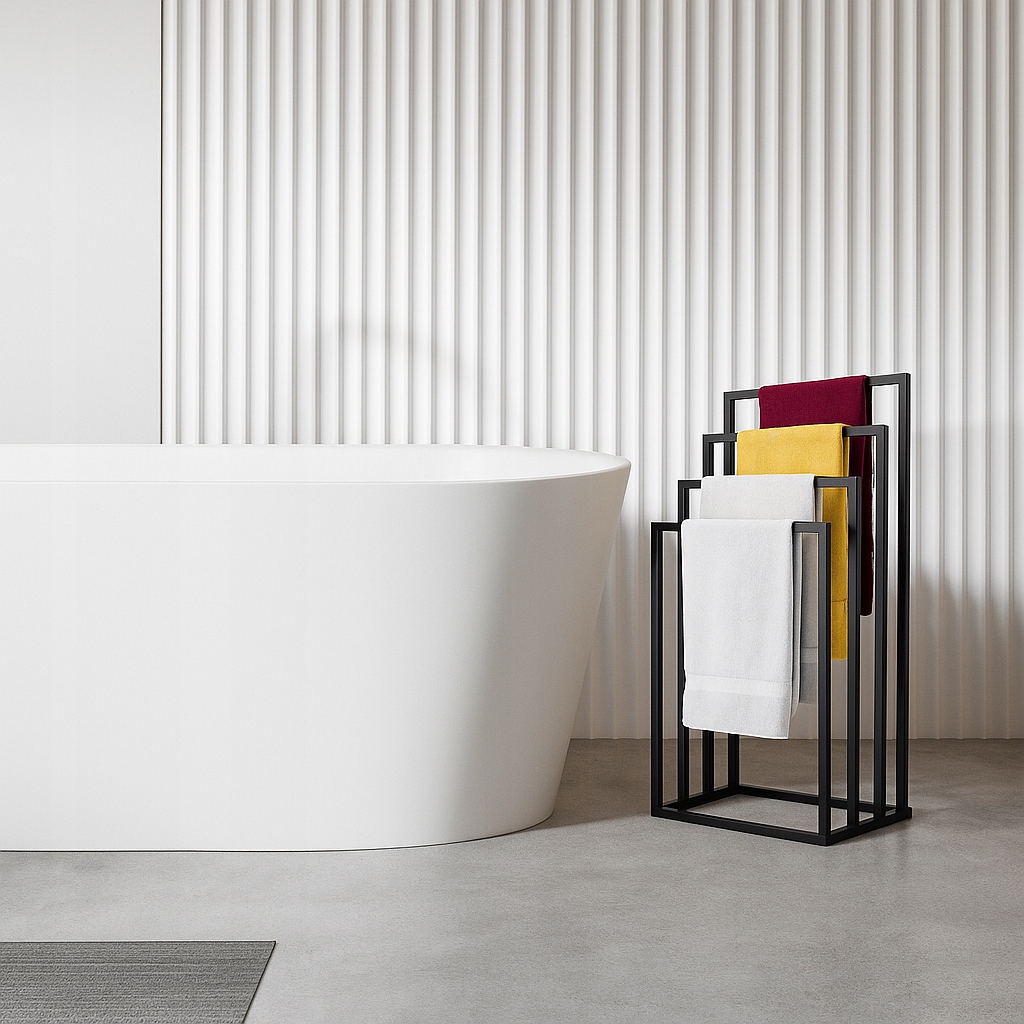 Стенд создан для максимального комфорта использования. Четыре перекладины разной высоты обеспечивают свободный приток воздуха, благодаря чему полотенца быстрее сохнут и дольше остаются свежими. Чистые линии и матовая поверхность придают ему элегантный, современный характер.
