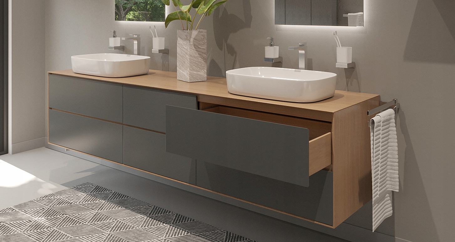 Возможность использования ящиков в шкафах. Подвесная система Libra H7 благодаря своей конструкции не мешает направляющим.