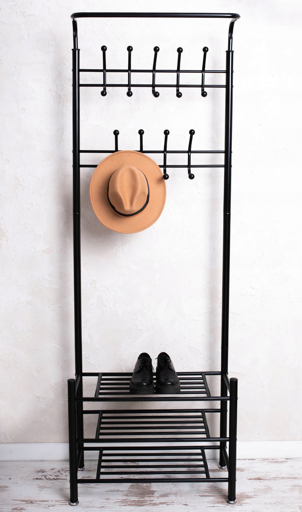 Ищете прочную вешалку для прихожей, в которой можно разместить куртки, пальто, обувь и аксессуары? Эта металлическая напольная вешалка с полками сочетает в себе минималистичный дизайн в стиле лофт с практичной организацией и идеально подходит как для маленьких, так и для больших интерьеров.