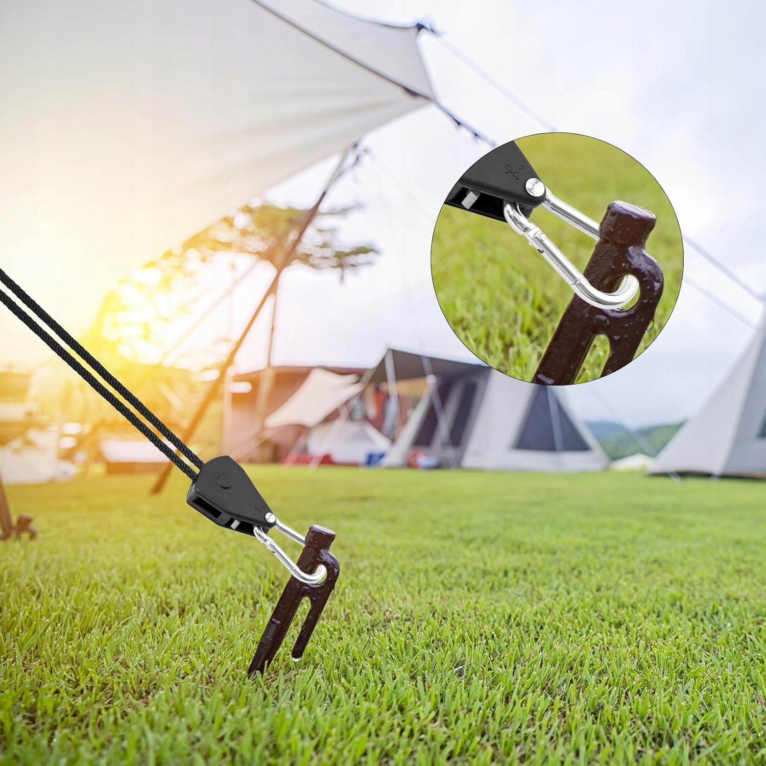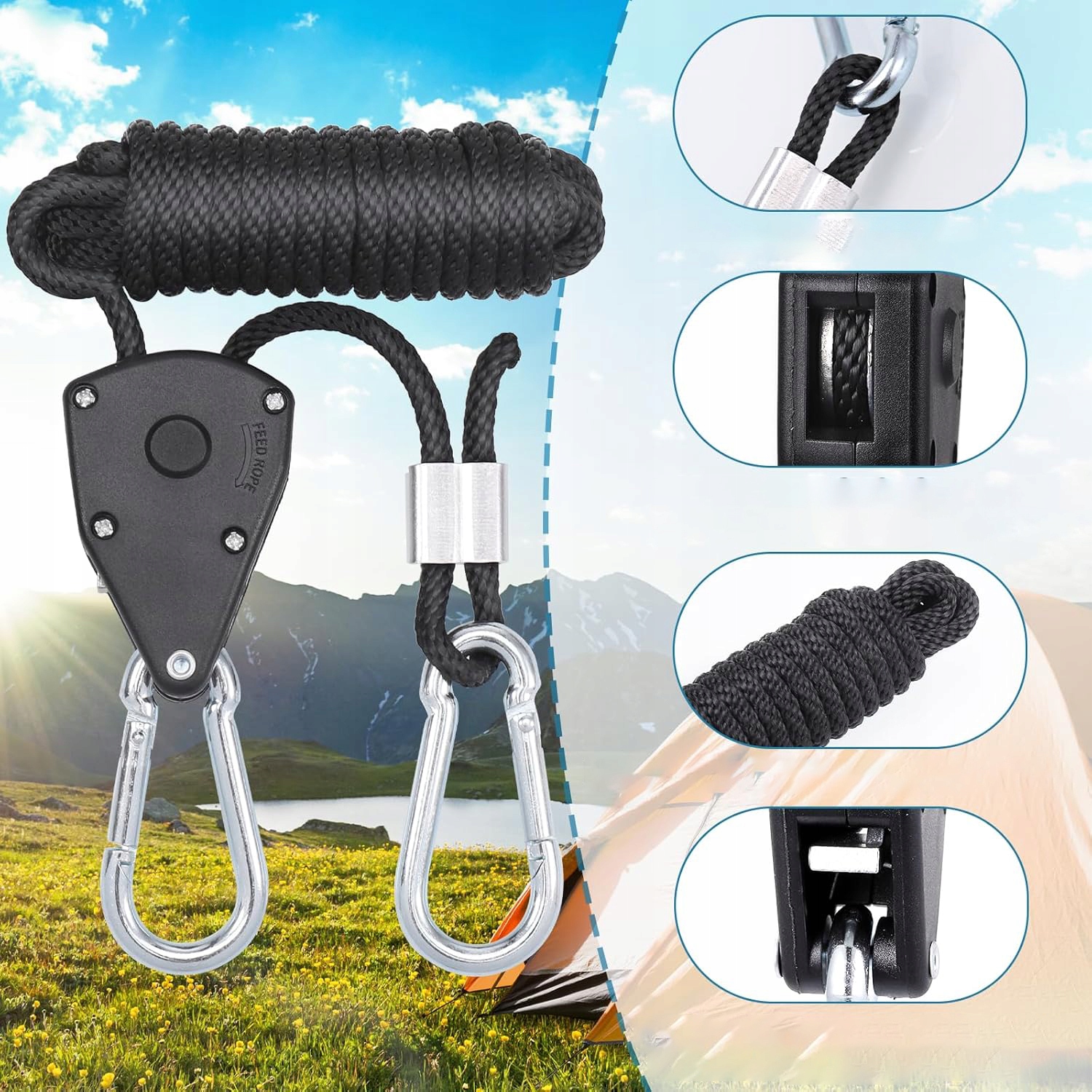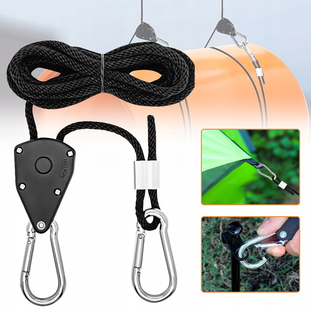 🏕 【Регулируемая】 защелка веревки с крючком имеет прочные металлические шестерни, которые позволяют быстро регулировать и блокировать веревку. Чтобы отрегулировать высоту подвесного объекта, просто потяните свободный конец веревки.