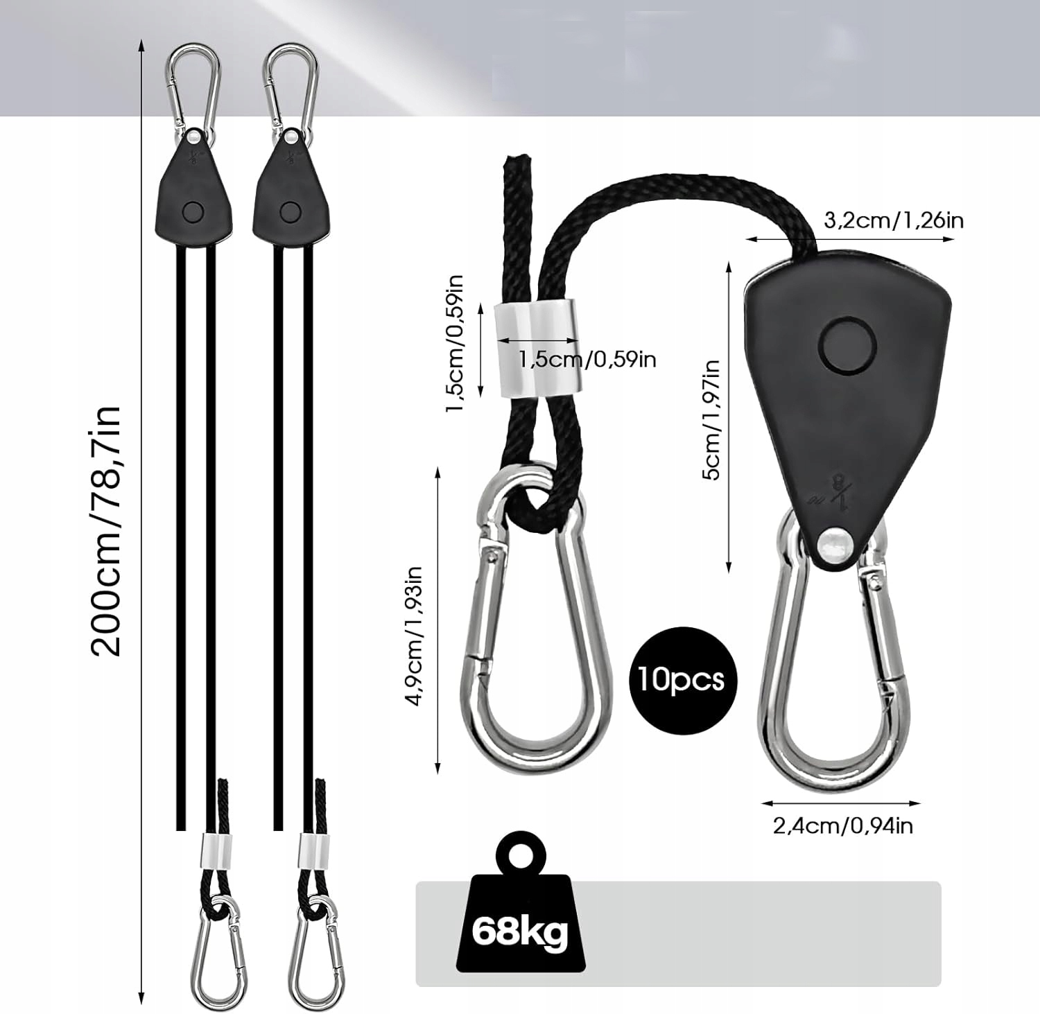 🏗 【Высокая грузоподъемность】 Каждый крюк с храповым сбором выдерживает нагрузку до 34 кг, поэтому пара может загружать в общей сложности 68 кг. Чтобы обеспечить максимальную гибкость и безопасность, рекомендуется использовать пару шкивов.
