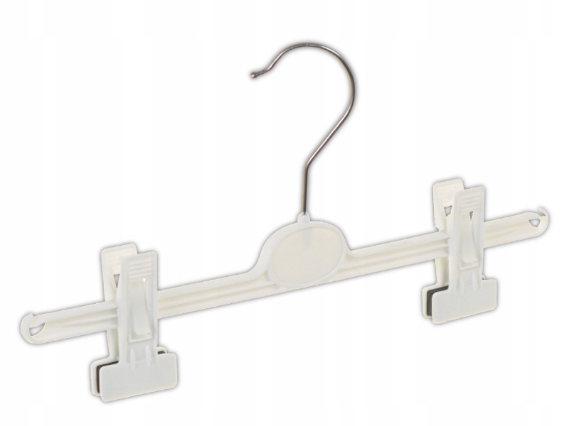 Вешалка-зажим, также называемая вешалкой для юбок, общей длиной около 32 см. Зажимы имеют очень сильное давление, что позволяет надежно удерживать одежду на вешалке. Под пряжками имеются резиновые накладки, которые не позволяют одежде повредиться или соскользнуть с вешалки. На концах вешалки имеются специальные выемки, облегчающие развешивание одежды.