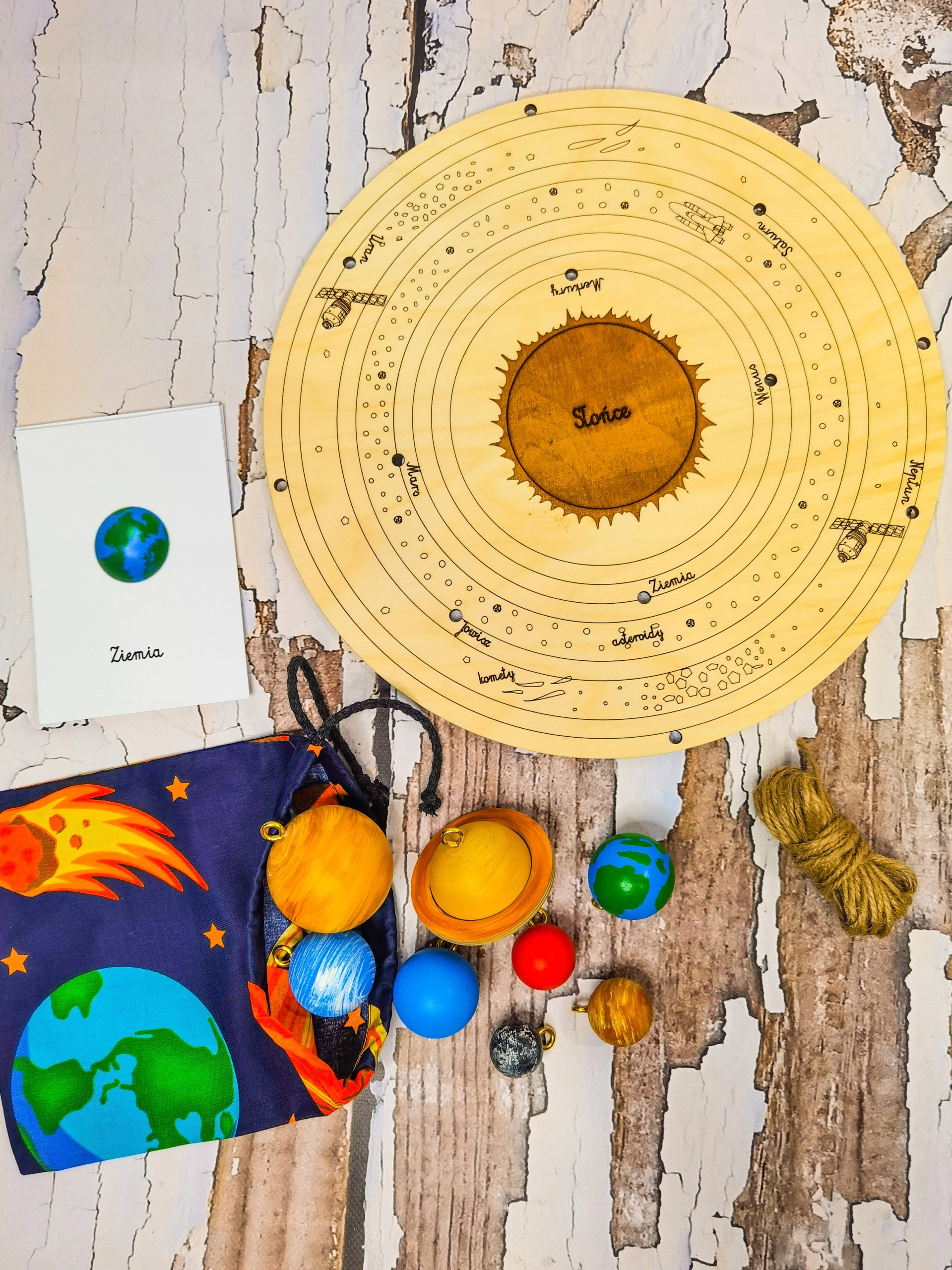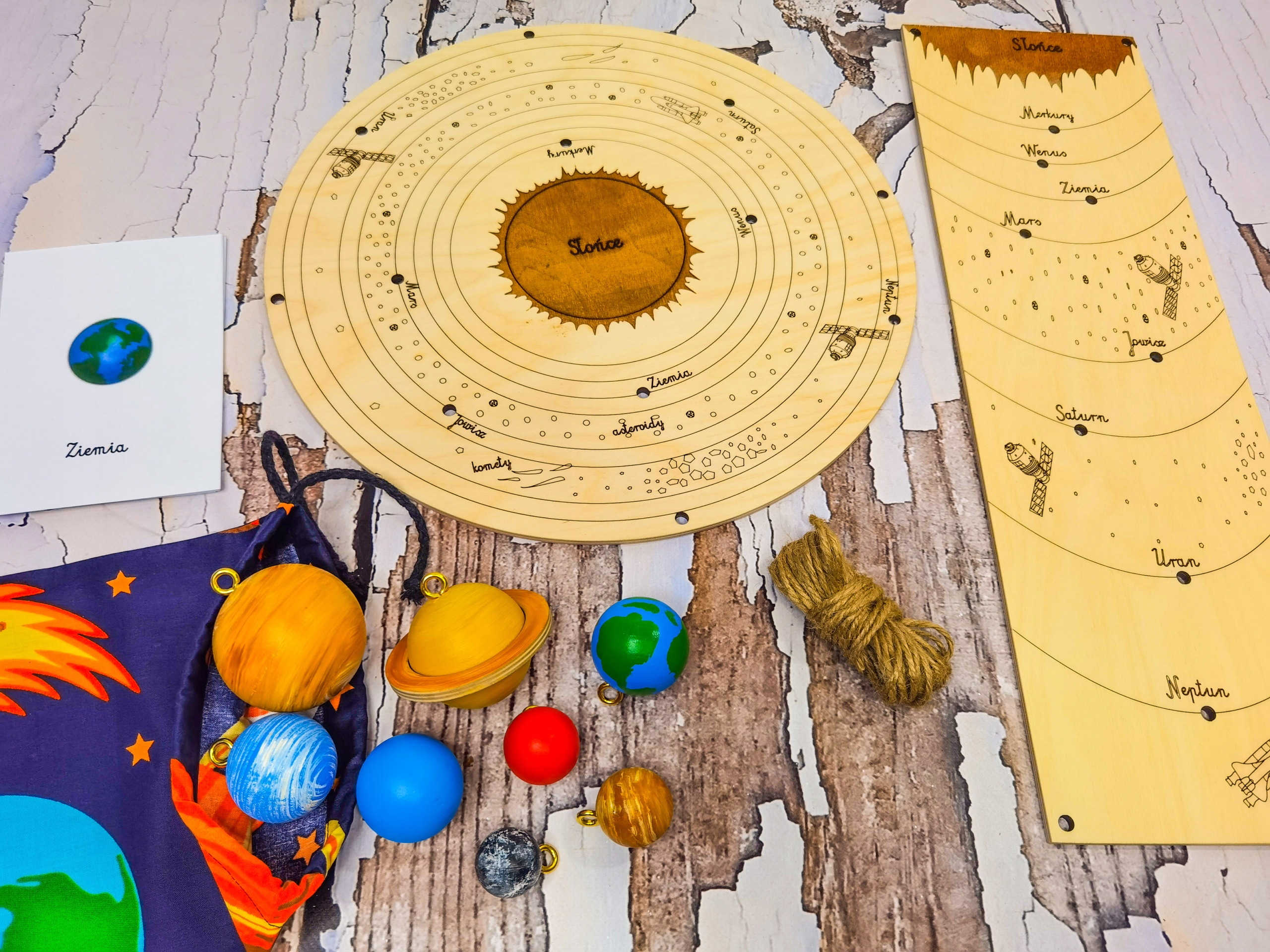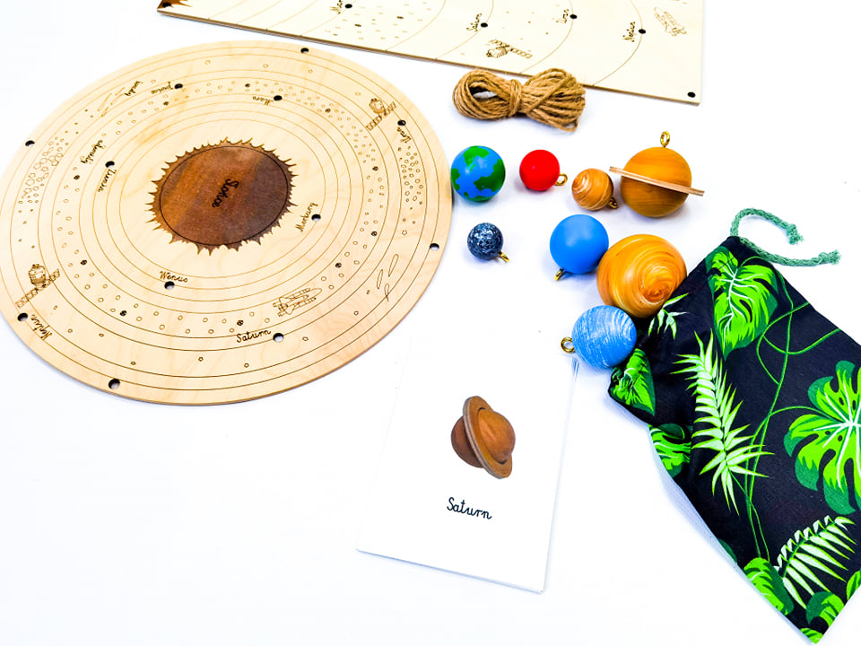 Ребенок сам готовит свое висящее пространство и в то же время укрепляет порядок планет в солнечной системе. Карты, включенные в набор, приведут ребенка ближе к внешнему виду и именам планет, чтобы ему было легче положить его на правильную орбиту.