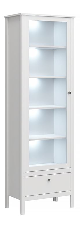Витрина Farge может функционировать как стеклянная витрина или небольшой книжный шкаф. Благодаря своим средним размерам 65х201х37 см он впишется в большинство комнат. Внутри мебели 4 полки, закрытые стеклянными дверцами с возможностью установки светодиодной подсветки, и 1 ящик с белым фасадом, закрытый на шариковых направляющих.