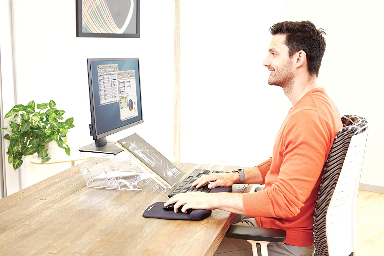 - Помогите минимизировать дискомфорт на рабочем месте, разместив монитор и документы в более эргономичном положении для просмотра с помощью кронштейна для монитора Clarity и держателя документов.