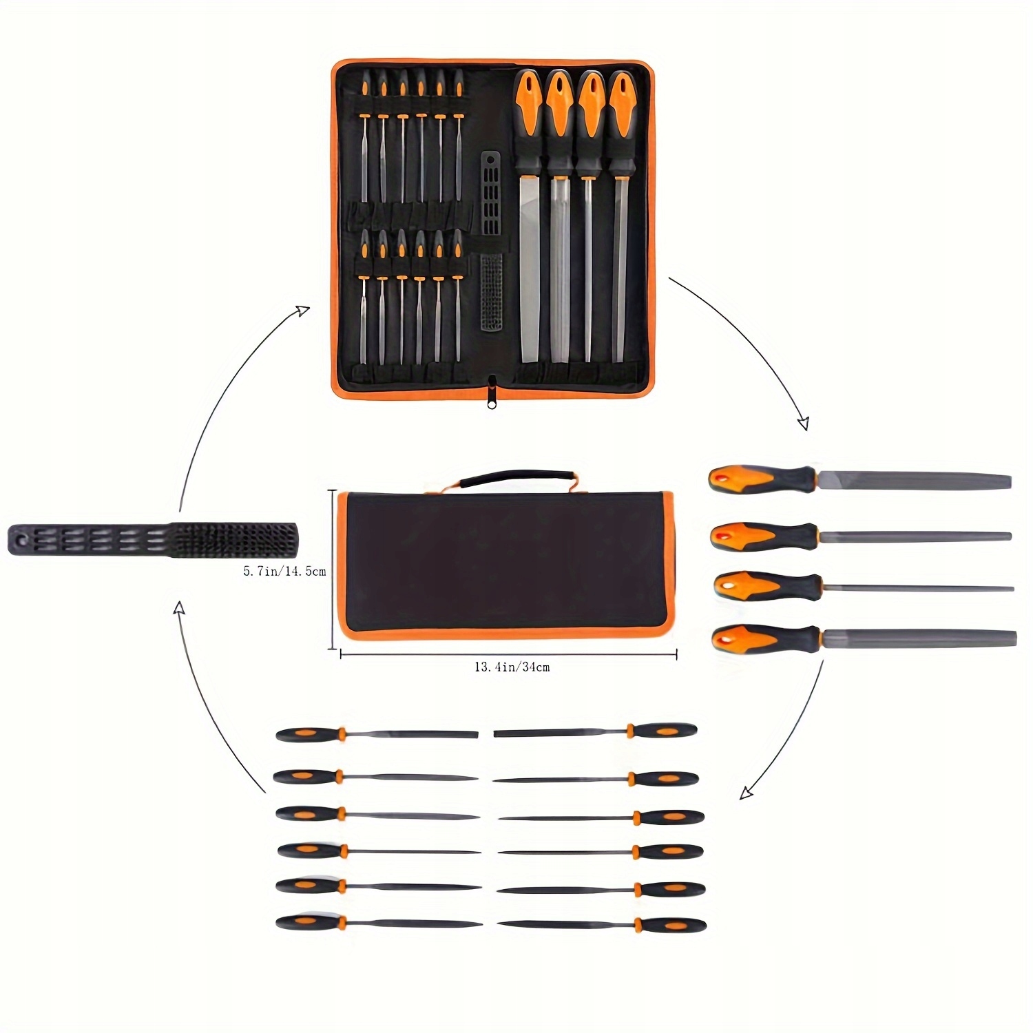 включая плоские, треугольные, полукруглые и круглые блоки, а также 12 надфилей и 1 щетку.