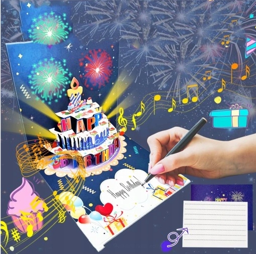 Поздравительные открытки для женщин имеют трехмерный всплывающий дизайн. Когда вы открываете открытку, трехмерный праздничный торт выскакивает из середины, а торт и свечи одновременно загораются в ритме праздничной песни, создавая потрясающее визуальное впечатление.
