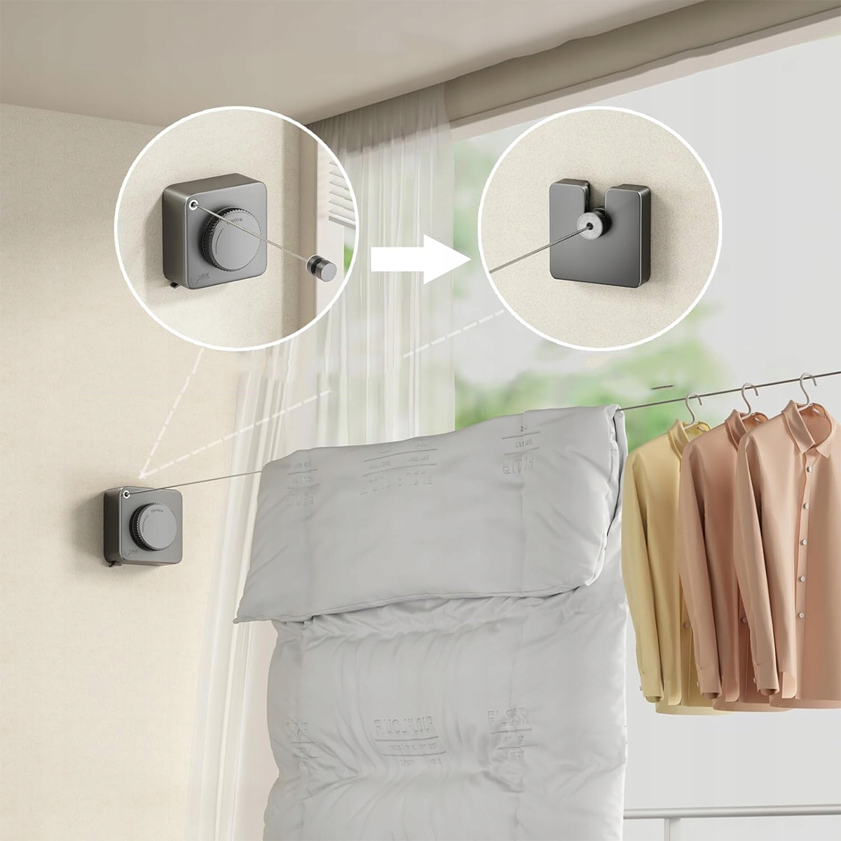 Наша бельевая веревка Если вам не нужно ее использовать, бельевые веревки можно убрать, они очень маленькие и не занимают места, вы даже проигнорируете тот факт, что у вас есть бельевая веревка. вынимайте его и повесьте на крючок, когда вам понадобится его использовать.