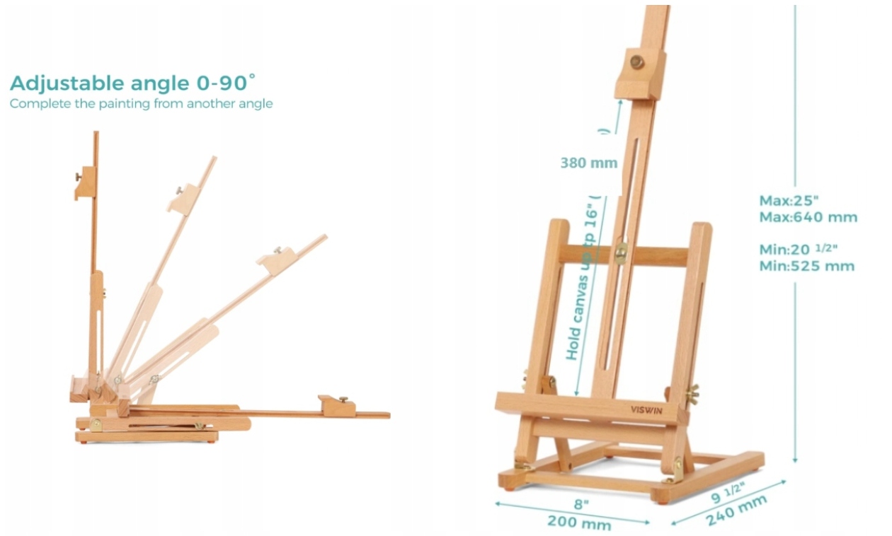 - Размеры мольберта 20 x 24 x 64 см (самый высокий), настольный мольберт вмещает холст высотой до 38 см, его можно регулировать под разными углами в соответствии с вашими личными потребностями, что позволяет в определенной степени избежать усталости рук и шеи, вызванной длительным рисованием. Металлические ручки легко привинчиваются и обеспечивают устойчивость.