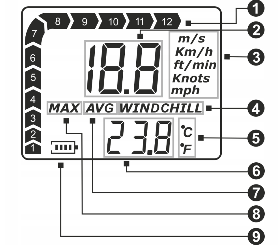 Разрешение: 0,1 (м/с) / 19 (футов/мин) / 0,2 (узлы) / 0,3 (км/ч) / 0,2 (миль/ч)