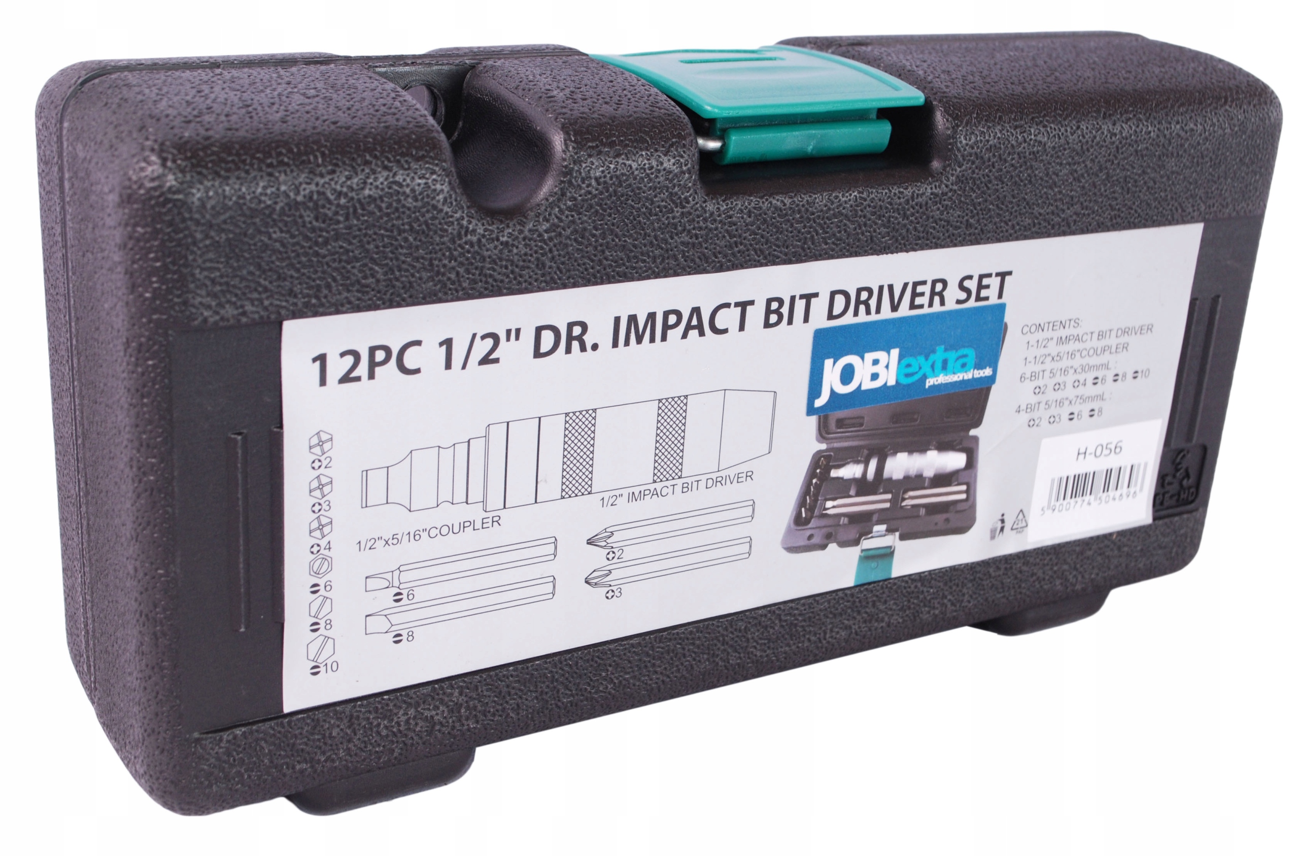Высококачественная ударная отвертка Honiton в наборе из 10 бит. Работает с головками 1/2". Изделие помещено в прочный пластиковый кейс.