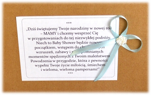 На внутренней стороне крышки красивые пожелания будущей маме, также украшенные синим бантиком.