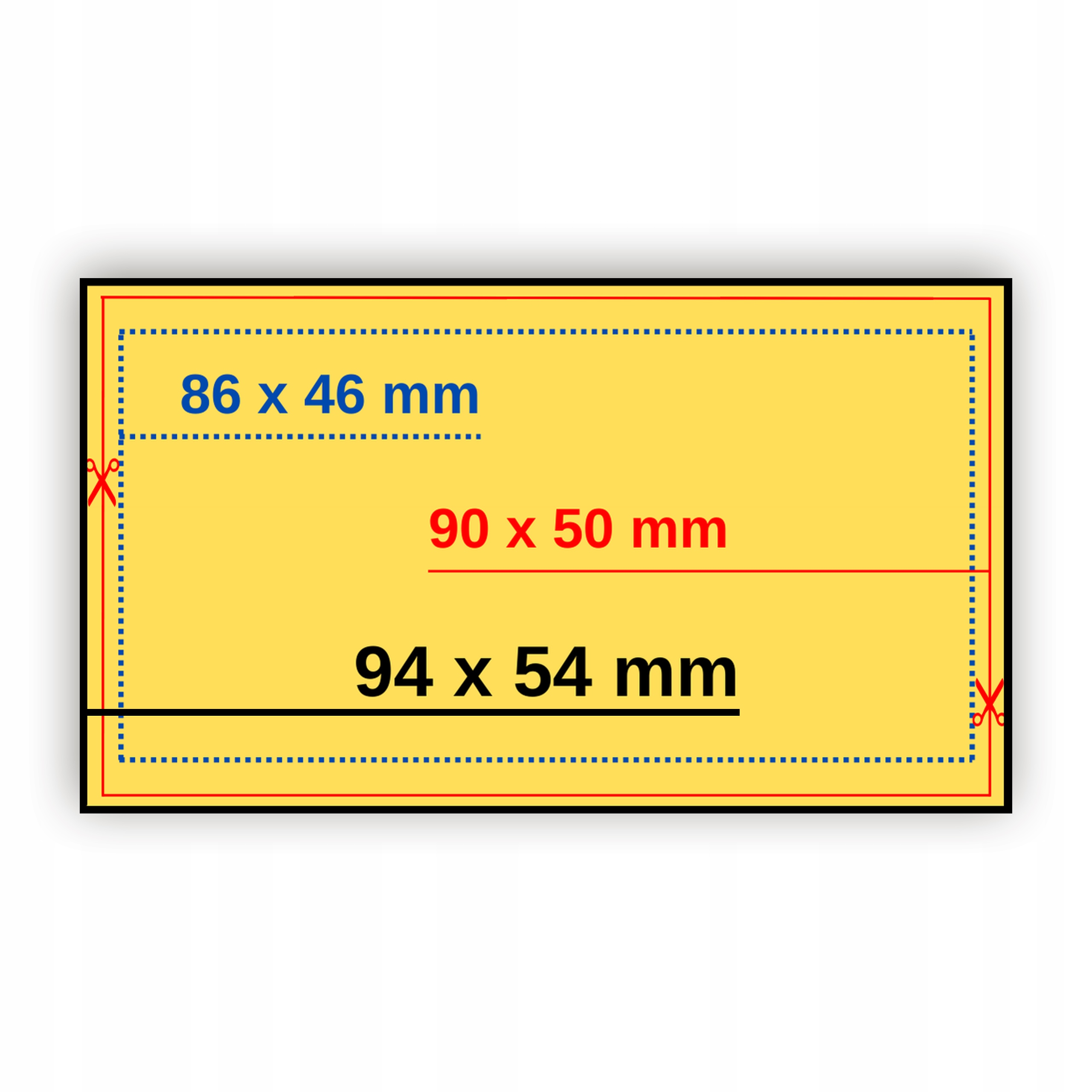 1. Формат визитки до резки (вылеты за обрез, отмечены черной рамкой): 89 x 59 мм или 94 x 54 мм - вылет 2 мм с каждой стороны