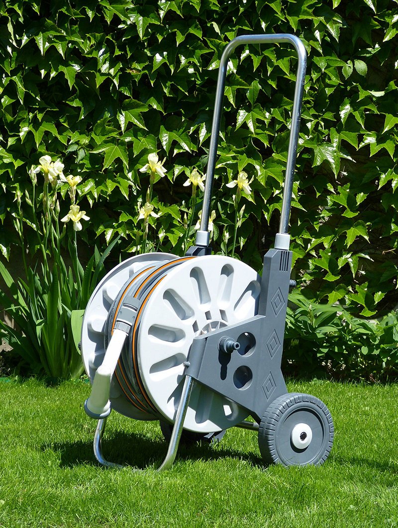 Алюминиевая тележка для садового шланга + 4-слойный садовый шланг Best Graphite 1/2" (~12,5 мм), 50 метров + аксессуары + ручной напорный распылитель + секторный импульсный разбрызгиватель с вертикальной и горизонтальной регулировкой.