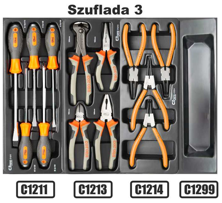 Новая модель - тележка для мастерской с 7 ящиками и аксессуарами. Всего в нем содержится 253 ключа и инструмента CORONA. В инструментальной тележке находится широкий ассортимент инструментов, гаечных ключей и бит, Г-образных ключей, торцевых ключей и плоскогубцев.