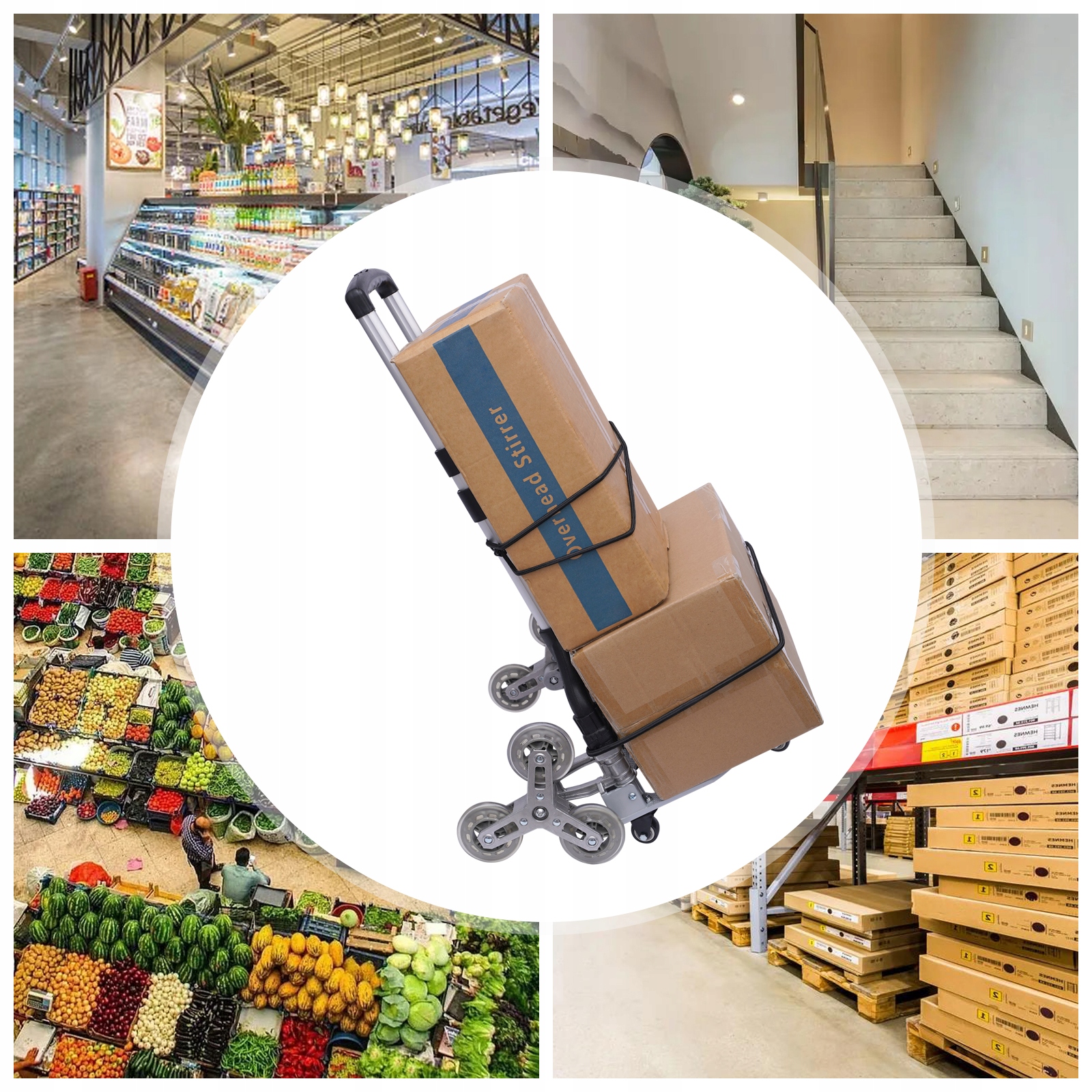 Эта тележка для подъема по лестнице предназначена для перевозки товаров, расходных материалов, продуктов, покупных предметов и различных тяжелых предметов. Подходит для домов, небольших магазинов, супермаркетов, торговых центров, фабрик и т. д.