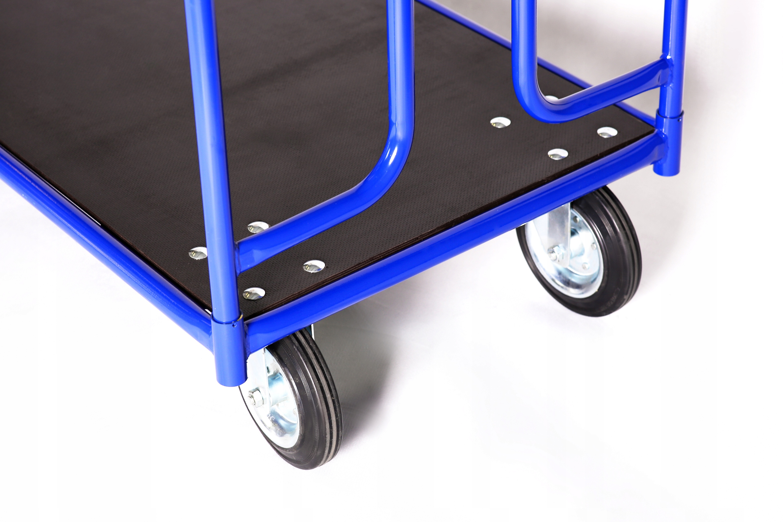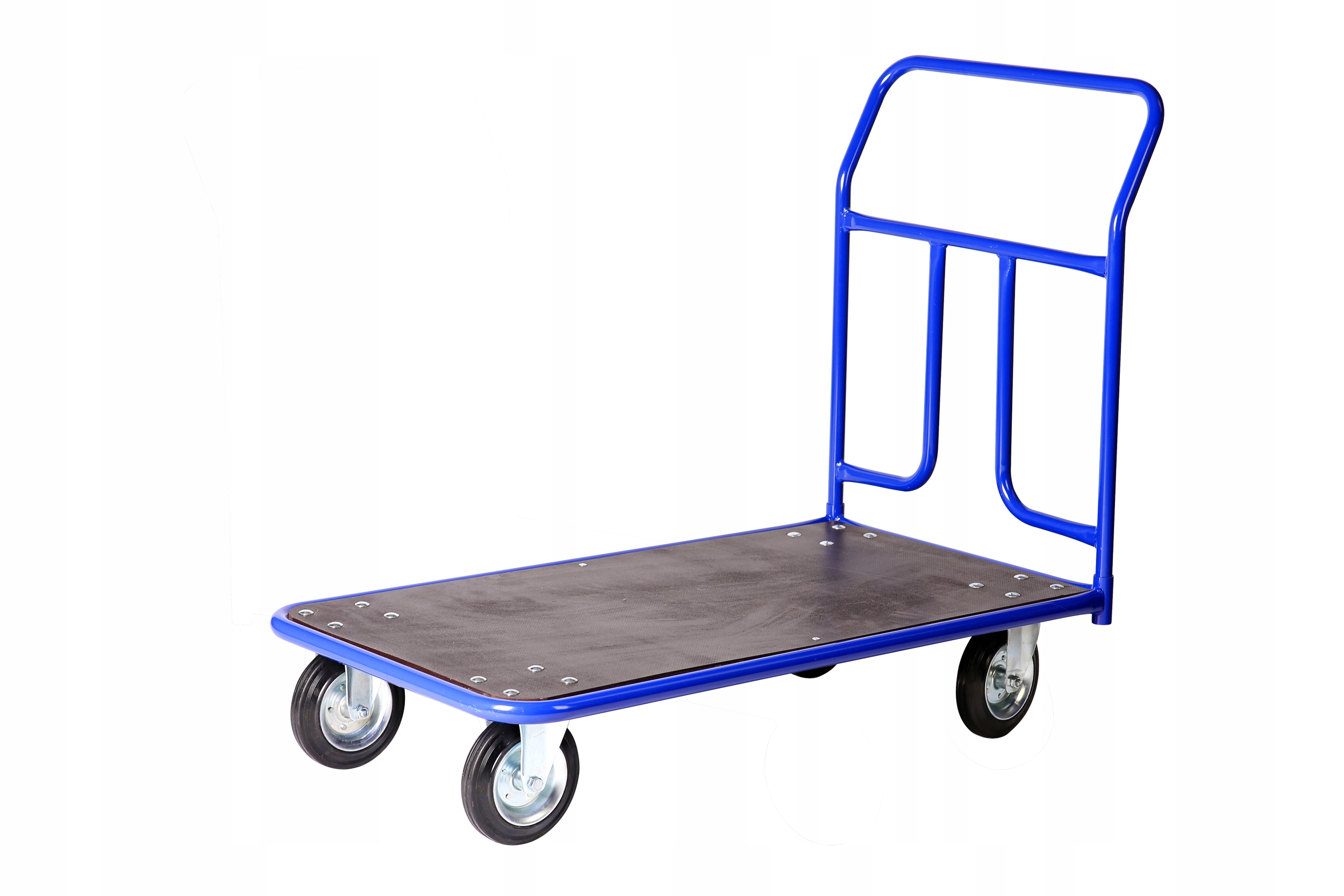 Прочная тележка-платформа с прочной конструкцией, облегчающая транспортировку тяжелых грузов. Удобная ручка и два поворотных задних колеса делают управление коляской чрезвычайно простым.